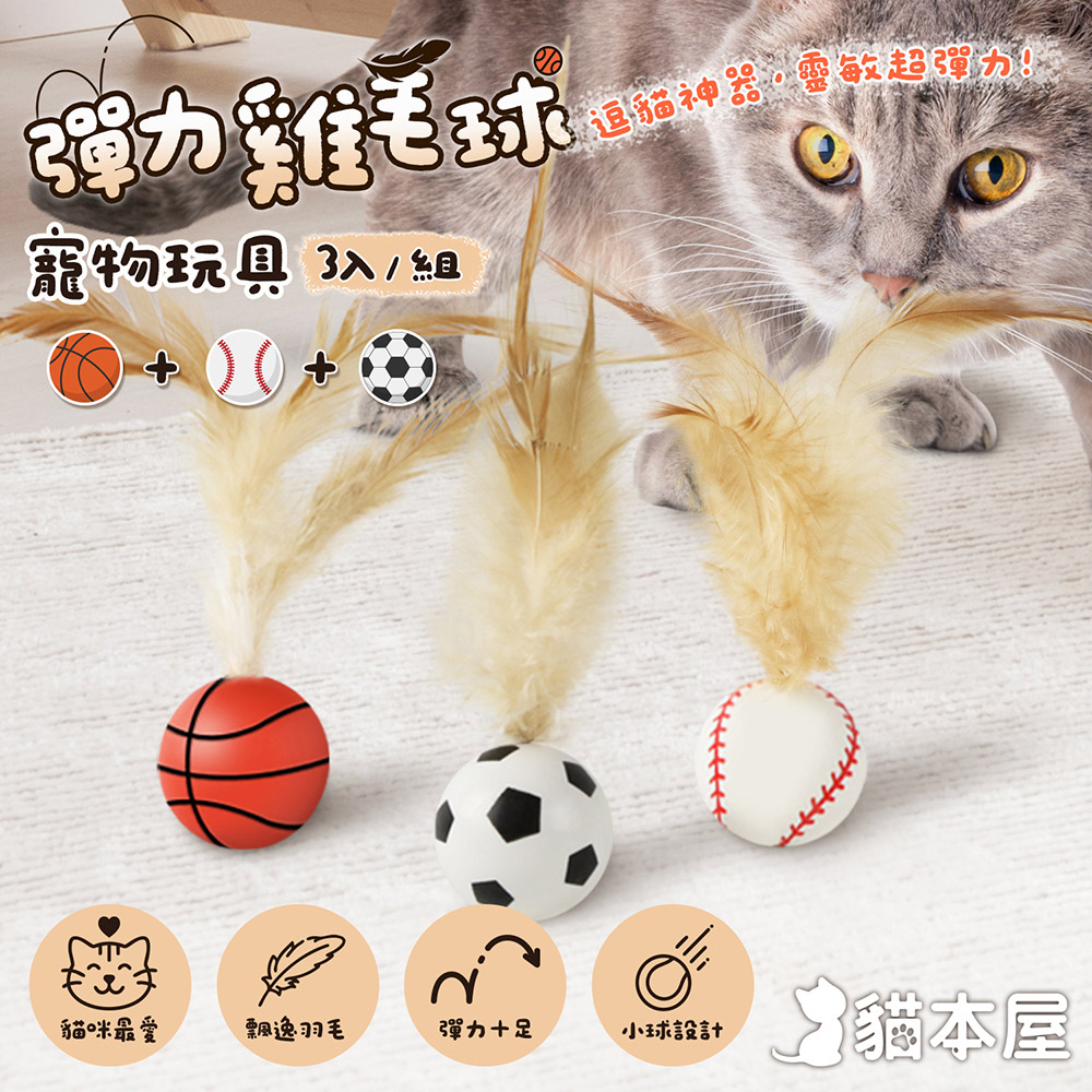 貓本屋 彈力雞毛球寵物玩具(3入組) 足球+籃球+棒球