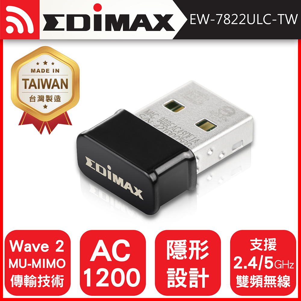 內容簡介 EDIMAX 訊舟 7822ULC 台灣製 AC1200 Wave2 雙頻USB無線網路卡 EW-7822ULC是一款極具威力的雙頻USB無線網路卡,它採用最新的11ac Wave2技術, 2.4GHz擁有300Mbps的傳輸效能,而5GHz傳輸速度也提升至867Mbps,搭配同採MU-MIMO技術的無線分享器,可以將所有Wi-Fi頻段的效能完全發揮出來滿足高畫質影音和其他數據資料密集型應用的需求,極輕極小設計不論您是Windows用戶或者Mac OS用戶,EW-7822ULC都是您升級AC無線新世代高速傳輸的最佳首選。 新一代11ac Wave2無線標準MU-MIMO傳輸技術,讓無線基地台可同時和多個MU-MIMO裝置進行通訊,大幅增加了WLAN的總輸送量和總容量。EW-7822ULC採用11ac MU-MIMO傳輸技術,搭配同採MU-MIMO技術的無線分享器,可以將所有Wi-Fi頻段的效能完全發揮出來,滿足高畫質影音和其他數據資料密集型應用的需求。 極簡黑鏡面、穩重而不單調的外觀設計,讓您搭配任何一款筆電或桌機都好看,重點是,它只有2g重,是市售同級產品中,擁有最輕的重量,卻同時具備極具威力的優異效能,不論您是Windows用戶或者Mac OS用戶都能使用,如此棒的設計,EW-7822ULC當然是您升級AC無線新世代首選。商品特色: ◆高速雙頻,5GHz和2.4GHz雙頻可供選擇,隨時切換至順暢穩定的Wi-Fi連線◆極輕巧2g羽量級隱形,不佔空間,插入即忘,免插拔,使用期限更長◆支援 MU-MIMO 多用戶多輸入多輸出技術,提供用戶更高效率的Wi-Fi傳輸◆Beamforming 技術讓無線信號品質更穩定,傳輸距離更遠◆支援最新的 WPA3-SAE (個人)及相容WPA2、WPA、WEP、802.1X 無線安全加密認證◆支援即插即用,通過 USB 埠立即升級您的 Windows 桌機和筆電到 Wi-Fi 5◆廣泛的相容性,適用於任何 Wi-Fi 路由器 基地台 無線訊號延伸器 擴大器搭配使用◆適用於嵌入式裝置、IoT 物聯網系統連線和控制,或是應用筆電 桌機等做視訊會議、 大型文件傳輸或高畫質影音串流◆支援作業系統 Windows、macOS 和 Linux ※為充分發揮11AC Wave 2 MU-MIMO高速傳輸效能,建議搭配使用EDIMAX 11AC Wave 2 MU-MIMO雙頻無線分享器 注意事項: 1.此產品無線傳輸的最大速度乃依據無線網路標準規範,實際數值資料與覆蓋範圍 則依據實際網路環境而有所不同。2.EDIMAX及其相關LOGO商標為EDIMAX訊舟科技版權註冊所有 其他的小與商標亦分屬其個別公司所擁有3.文中所記載產品之規格、功能或外觀等資訊,可能因產品改良而變更, 請以實際銷售產品或以訊舟原廠資訊為主,恕不另行通知。