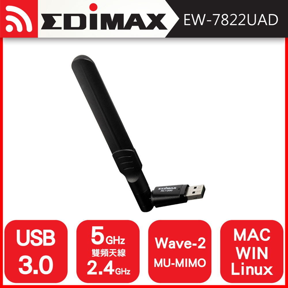 內容簡介 EDIMAX 訊舟 AC1200 雙頻 長距離USB 3.0無線網路卡 EW-7822UAD是一款極具威力的長距離USB 3.0無線網路卡,它採用最新的11ac Wave2技術,2.4GHz擁有300Mbps的傳輸效能,而5GHz無線傳輸速度也提升至867Mbps,搭配同採MU-MIMO技術的無線分享器,可以將所有Wi-Fi頻段的效能完全發揮出來滿足高畫質影音和其他數據資料密集型應用的需求,不論您是Windows用戶、Mac OS或者 Linux用戶,EW-7822UAD都是您升級AC無線新世代高速傳輸的最佳首選。 新一代11ac Wave2無線標準MU-MIMO傳輸技術,讓無線基地台可同時和多個MU-MIMO裝置進行通訊,大幅增加了WLAN的總輸送量和總容量。EW-7822UAD提供超高的訊號吞吐量,並採用11ac MU-MIMO傳輸技術,搭配同採MU-MIMO技術的無線分享器,可以將所有Wi-Fi頻段的效能完全發揮出來,滿足高畫質影音和其他數據資料密集型應用的需求。 可調式天線易於調節,多方向收訊, 更適於不同場域,調整天線角度以獲得最佳的 Wi-Fi 性能!商品特色: ◆支援802.11 ac雙頻無線網路傳輸技術,2.4GHz無線傳輸 速率最高可達300Mbps,5GHz無線傳輸速率最高可達867Mbps ◆採用Wave 2 MU-MIMO技術(*)◆可調式天線,多方向收訊, 更適於不同場域◆支援多種作業系統:Windows 10、 Mac OS 10.7 Linux:Kernel2.6.24 - 5.3 (支援Fedora或Ubuntu) (*) 為充分發揮11AC Wave 2 MU-MIMO高速傳輸效能,建議搭配使用EDIMAX 11AC Wave 2 MU-MIMO雙頻無線分享器 注意事項: 1.此產品無線傳輸的最大速度乃依據IEEE 802.11 ac標準規範 實際數值資料與覆蓋範圍則依據實際網際網環境而有所不同2.EDIMAX及其相關LOGO商標為EDIMAX訊舟科技版權註冊所有 其他的小與商標亦分屬其個別公司所擁有3.文中所記載產品之規格、功能或外觀等資訊,可能因產品改良而變更, 請以實際銷售產品或以訊舟原廠資訊為主。