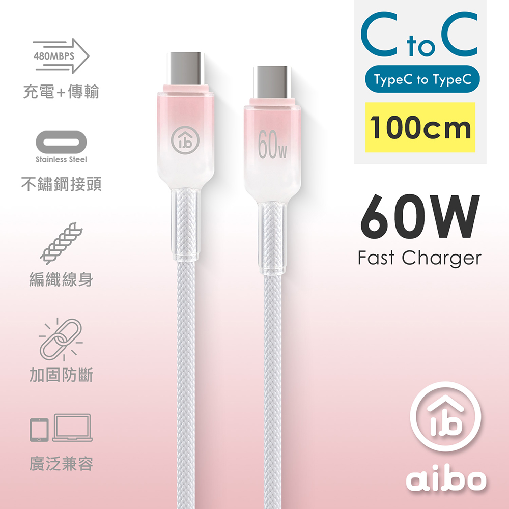 aibo Type-C to Type-C 60W快充傳輸線(1M) 雪白粉