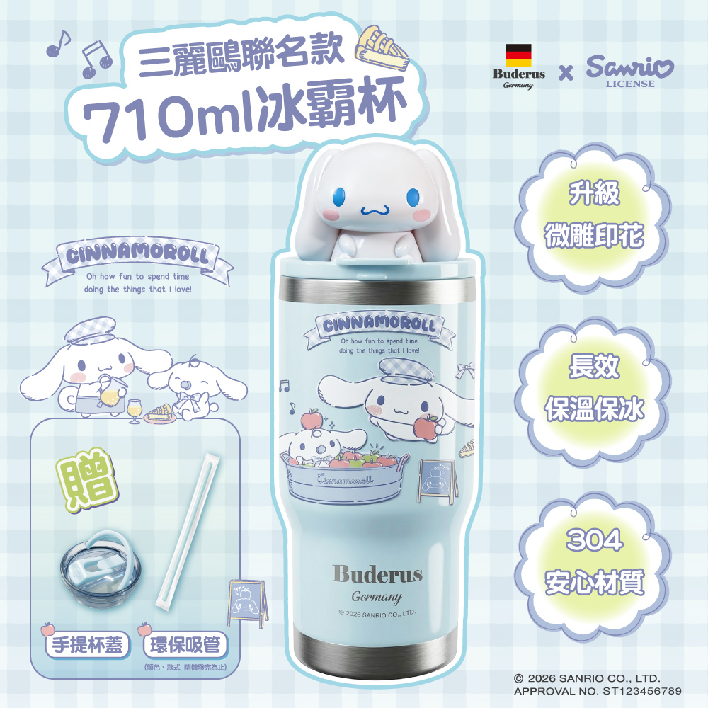 內容簡介 ✨ 商品升級✨杯蓋升級:新式提握設計,輕鬆提起即可攜行,通勤、旅行更方便。印刷升級:3D立體浮雕印刷,色澤持久不易掉漆,質感細緻更有特色。長效保溫保冰:陶瓷塗層+雙層不鏽鋼真空結構,保冷保熱效果持久,四季都適用。大容量設計:足夠裝載整日所需飲品,滿足上班、外出、運動各種需求。安心材質:食品級304不鏽鋼,堅固耐用,不殘留異味,安全又健康。品名:【德國Buderus】三麗鷗聯名款陶瓷冰霸杯 710ml 款式: 大耳狗適用吸管 : 吸管口適用於一般吸管 (珍珠吸管會太緊)杯口 杯底: 杯口直徑約8.5cm, 杯底約7.5cm 高度約25cm包裝尺寸 : 9.5cm X 9.5cm X 28~32cm 容量 : 710ml(滿水位)重量 : 約400g (±10%)材質 : 304不鏽鋼材 食品級矽膠圈 食品ABS杯蓋 塗裝 : 食品級塑粉亮光漆 杯內:無毒陶瓷塗層耐熱溫度:0~100°C透明杯蓋ABS:耐熱度70~100℃*隨盒附贈環保吸管乙入 (贈品款式顏色隨機出貨, 送完為止)台灣設計監造MADE IN CHINA【產品注意事項】請避免撞擊及墜落,以免摔壞保溫杯身,影響保溫性能。請勿放在熱源旁邊,以免影響功能。置於小孩觸摸不到的地方。清潔時勿使用鹼性漂白劑、金屬劑、化學抹布等。【真空保溫杯內請勿加入以下物質】1.醬油、湯等鹽分或腐蝕性物質。2.避免任何形式的直接加熱。3.乾冰、碳酸飲料等(內壓升高會導致杯蓋無法打開或杯中液體噴出)。4.裝入牛奶等易腐敗的飲料後,請盡快飲用並進行清洗以免變質。【出貨須知】因運送過程中,難免外包裝會有稍微摺痕及運送痕跡,故補償最新環保科技PETG吸管(不易殘留刮痕、脆裂、更耐高溫),如能接受請在下單,謝謝。【檢驗報告與保障】本產品通過歐規EFSA、美國FDA、台灣SGS安全認證本產品已投保國泰產物產品責任保險$2600萬元