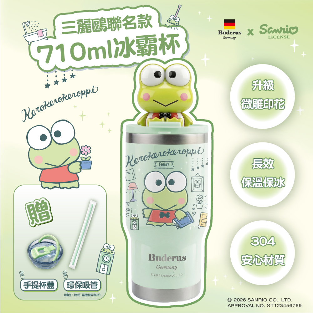 內容簡介 ✨ 商品升級✨杯蓋升級:新式提握設計,輕鬆提起即可攜行,通勤、旅行更方便。印刷升級:3D立體浮雕印刷,色澤持久不易掉漆,質感細緻更有特色。長效保溫保冰:陶瓷塗層+雙層不鏽鋼真空結構,保冷保熱效果持久,四季都適用。大容量設計:足夠裝載整日所需飲品,滿足上班、外出、運動各種需求。安心材質:食品級304不鏽鋼,堅固耐用,不殘留異味,安全又健康。品名:【德國Buderus】三麗鷗聯名款陶瓷冰霸杯 710ml 款式: 大眼蛙適用吸管 : 吸管口適用於一般吸管 (珍珠吸管會太緊)杯口 杯底: 杯口直徑約8.5cm, 杯底約7.5cm 高度約25cm包裝尺寸 : 9.5cm X 9.5cm X 28~32cm 容量 : 710ml(滿水位)重量 : 約400g (±10%)材質 : 304不鏽鋼材 食品級矽膠圈 食品ABS杯蓋 塗裝 : 食品級塑粉亮光漆 杯內:無毒陶瓷塗層耐熱溫度:0~100°C透明杯蓋ABS:耐熱度70~100℃*隨盒附贈環保吸管乙入 (贈品款式顏色隨機出貨, 送完為止)台灣設計監造MADE IN CHINA【產品注意事項】請避免撞擊及墜落,以免摔壞保溫杯身,影響保溫性能。請勿放在熱源旁邊,以免影響功能。置於小孩觸摸不到的地方。清潔時勿使用鹼性漂白劑、金屬劑、化學抹布等。【真空保溫杯內請勿加入以下物質】1.醬油、湯等鹽分或腐蝕性物質。2.避免任何形式的直接加熱。3.乾冰、碳酸飲料等(內壓升高會導致杯蓋無法打開或杯中液體噴出)。4.裝入牛奶等易腐敗的飲料後,請盡快飲用並進行清洗以免變質。【出貨須知】因運送過程中,難免外包裝會有稍微摺痕及運送痕跡,故補償最新環保科技PETG吸管(不易殘留刮痕、脆裂、更耐高溫),如能接受請在下單,謝謝。【檢驗報告與保障】本產品通過歐規EFSA、美國FDA、台灣SGS安全認證本產品已投保國泰產物產品責任保險$2600萬元
