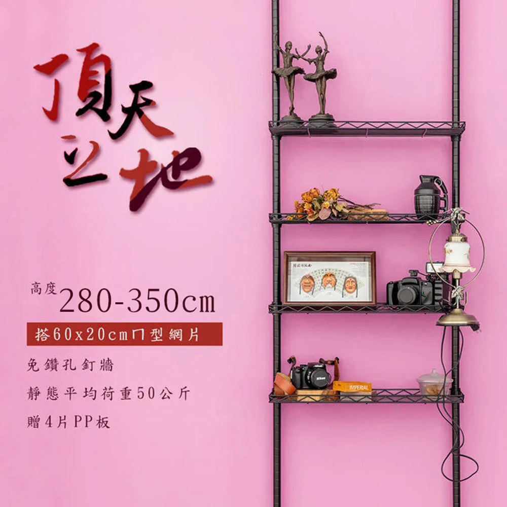 商品描述 | 【dayneeds】三代│頂天立地烤漆收納架 搭60x20ㄇ型網片4片 (加贈PP板4片) 白色:表面採用粉體烤漆處理不易生鏽堅固耐用依居家空間自由調節高度不鑽孔整體平均荷重達50公斤 |