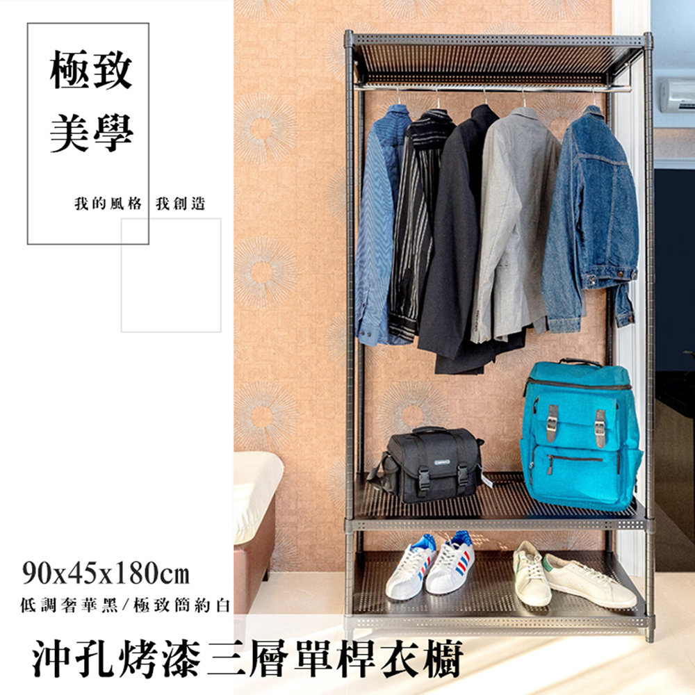 商品描述 | 【dayneeds】沖孔 90x45x180公分 三層烤漆單桿衣櫥 黑色:沖孔鐵板層架四角處皆採用全飽滿式電桿條式連接法堅固耐用透氣防潮沖孔設計結構穩定拆裝容易高耐重高彈性提供層架 |
