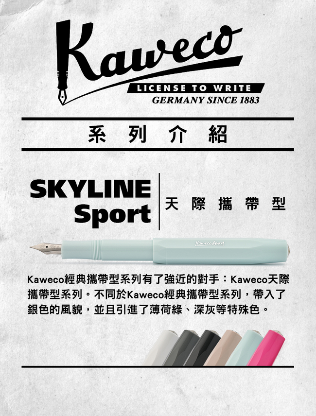 Kaweco持續在傳統與創新之間堅持不懈,時至今日,已開發出多樣化書寫工具與全套配件,並在超過四十餘個國家銷售。