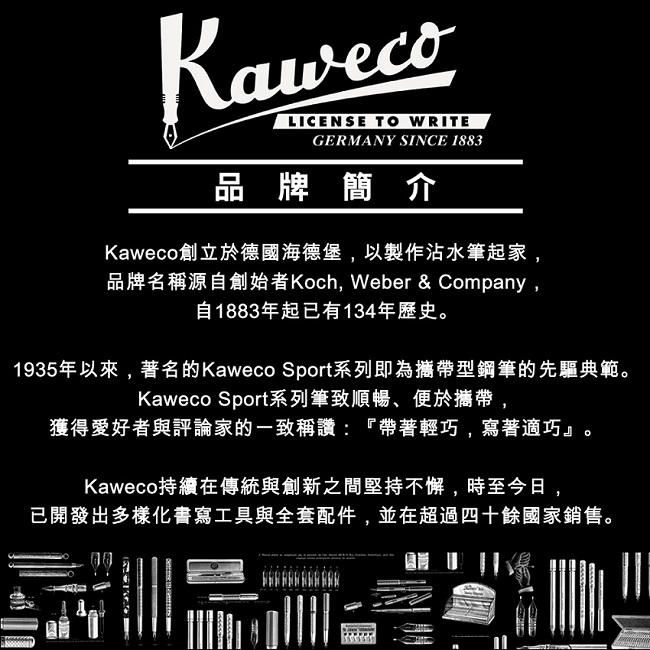Kaweco持續在傳統與創新之間堅持不懈,時至今日,已開發出多樣化書寫工具與全套配件,並在超過四十餘個國家銷售。
