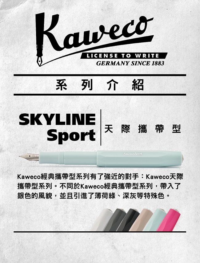 Kaweco Skyline Sport系列 ABS樹脂,銀色的Kaweco標誌與筆尖,特殊八角造型,可搭配金色或銀色筆夾