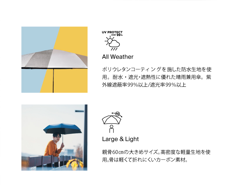 .輕量晴雨兩用傘,紫外線遮蔽率、遮光率99%以上。