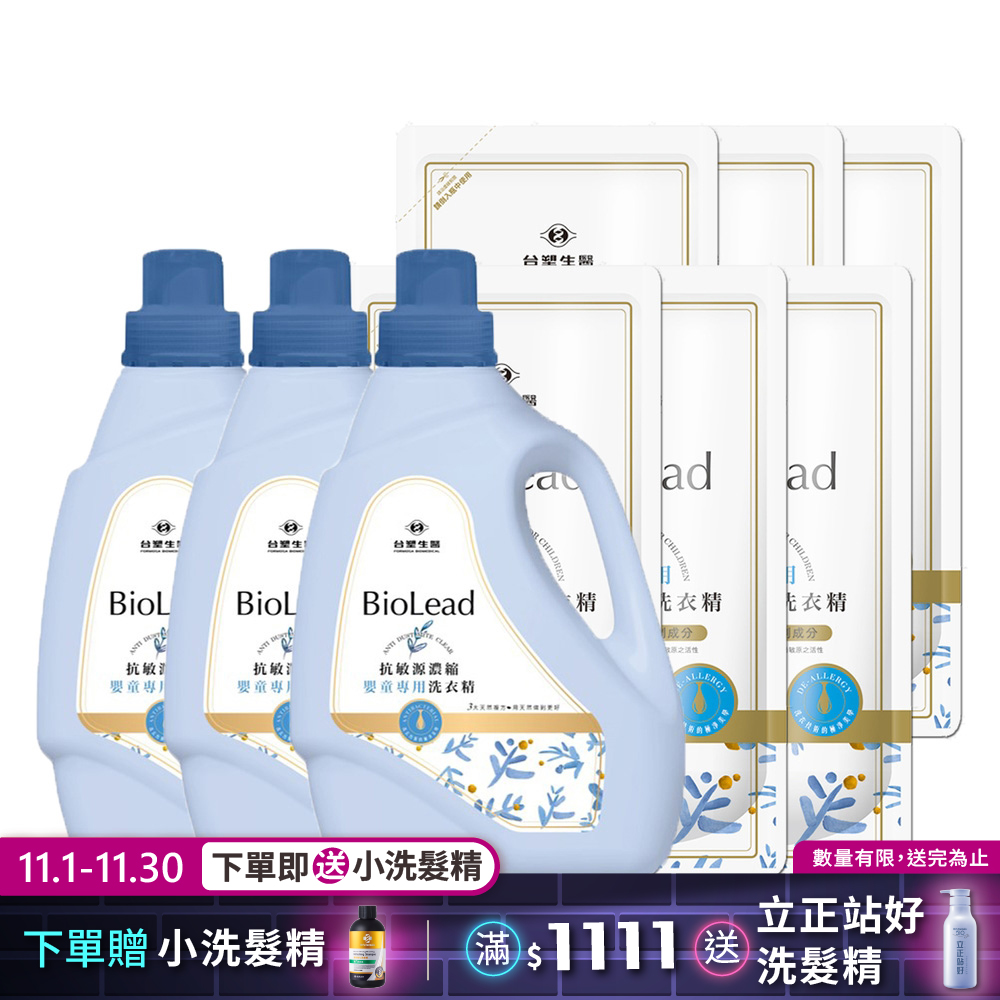 《台塑生醫》BioLead抗敏原濃縮洗衣精 嬰幼兒衣物專用(3瓶+6包)