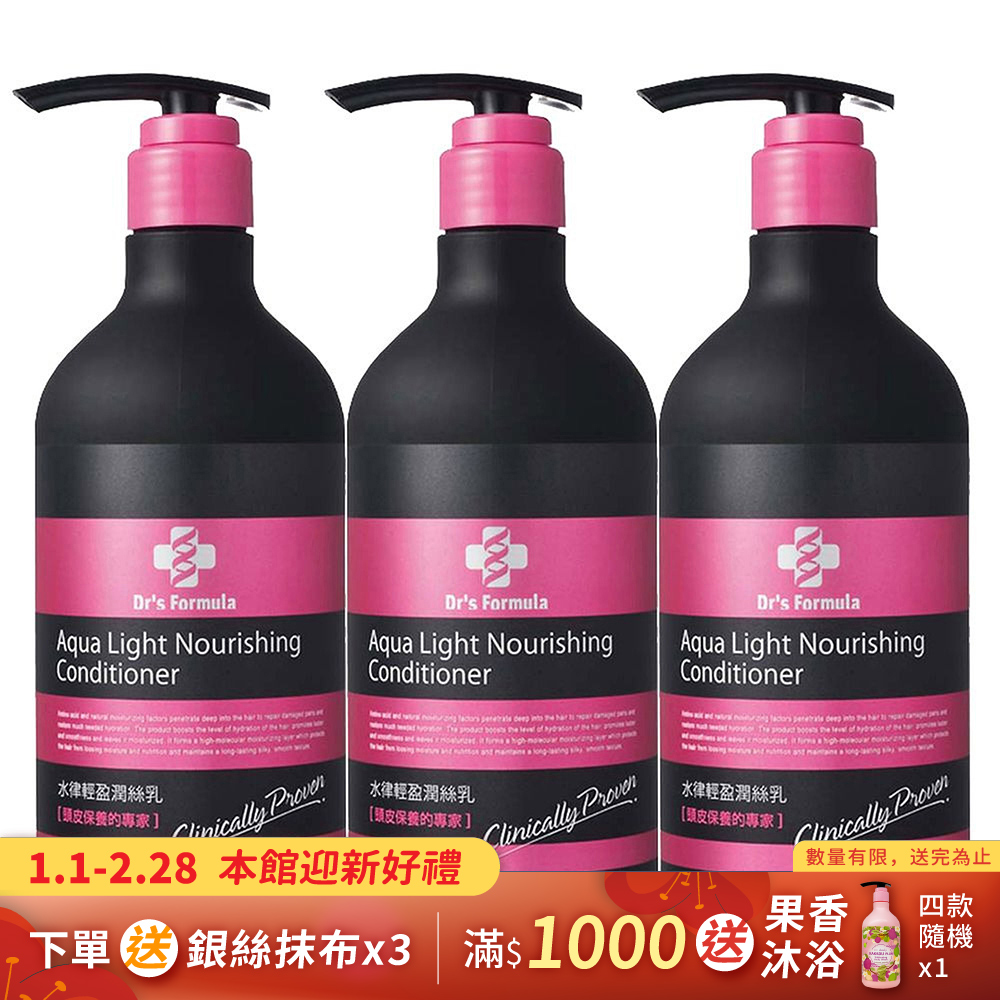 內容簡介 商品規格:水律輕盈潤絲乳530g*3 全成分:Aqua, Propylene Glycol, Pentylene Glycol, Cetearyl Alcohol, Dipalmitoylethyl Hydroxyethylmonium Methosulfate, Ceteareth-20, Polyquaternium 37, Dicaprate Dicaprylate, PPG-1 Trideceth-6, Fragrance, Palmamidopropyltrimonium Chloride, Dicocoylethyl hydroxyethylmonium methosulfate, Stearyl trimethyl Ammonium chloride, .Hydrogenated Polyisobutene, Jojoba Oil, Glycerin, Moringa Pterygosperma Seed Extract, Hydrolyzed Keratin, Phytosteryl Octyldodecyl Lauroyl Glutamate, Camellia Oleifera Seed Oil, Methylisothiazolinone, Iodopropynyl Butylcarbamate, Camellia Sinensis Leaf Extract, Polyquaternium-10, Arginine 保存日期:製造日起3年 製造日期:標示於瓶身(月 日 年) 保存方法:請放置於乾燥陰涼處,避免陽光直接照射。