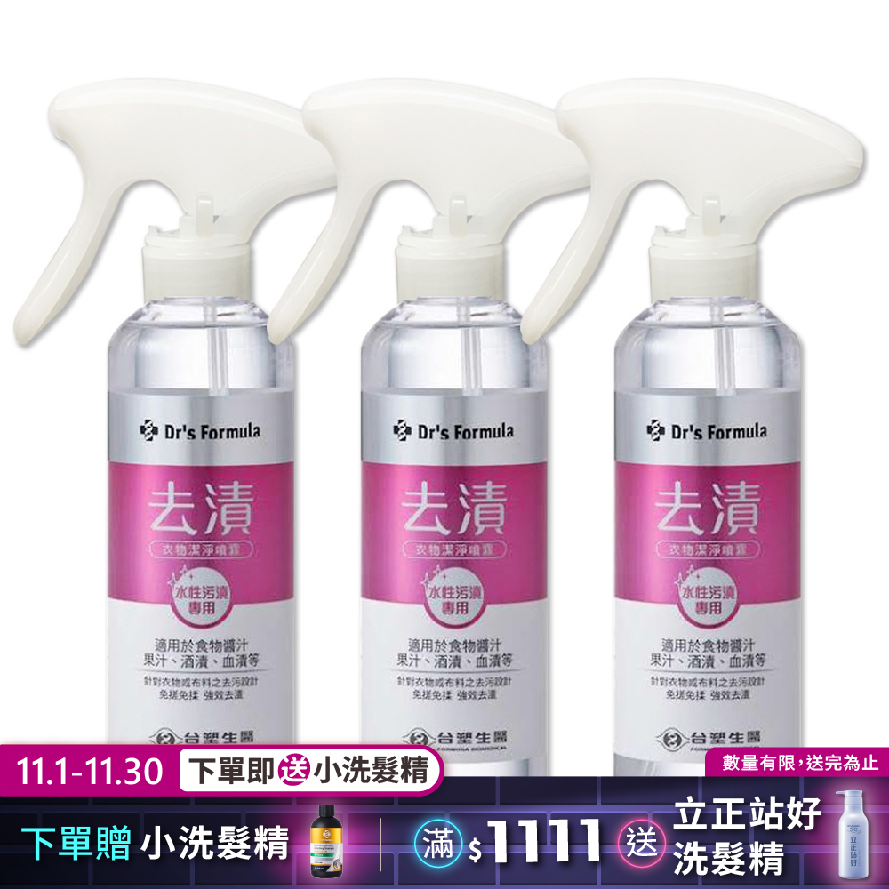 | 簡介 / | 《台塑生醫》Dr's Formula去漬衣物潔淨噴霧(水性污漬專用)255g(3入 組):‧適用於食物醬汁、果汁、酒漬、血漬等。‧針對衣物或布料之去汙設計。‧免搓免揉、強效去漬。‧水 |