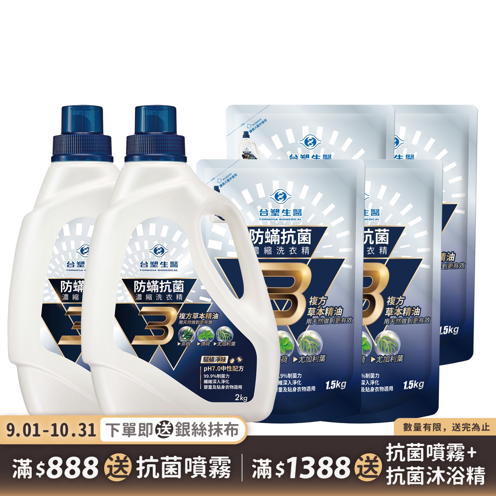 內容簡介 3複方草本精油 用天然做到更有效• 強效防蹣:應用茶樹、薄荷、尤加利葉等3複方精油成分,於一般水溫(25℃)下洗衣即能達到,洗後天然芳香,大人小孩衣物皆適用。• 運用天然高效之「葡萄柚籽」抑菌成分,結合「氯己定」達雙重抗菌之效,經實驗證實能有效抑制大腸桿菌、金黃色葡萄球菌、白色念珠菌等、綠膿桿菌等十餘種生活常見細菌,潔淨更安心。適用範圍:適用於棉、麻、化纖及混紡等質料之衣物,但不可洗滌食物及蔬果。品名:《台塑生醫》BioLea防蹣抗菌濃縮洗衣精(2kgx2瓶+補充包1.5kgx4包)成份:直鏈烷基苯磺酸、氫氧化鈉、月桂醇聚氧化乙烯醚鈉鹽、聚氧乙烯月桂醇醚、聚丙烯酸鈉、甲基纖維素、芒硝、氯己定葡糖酸鹽、複方精油(茶樹、尤加利、薄荷精油)、防腐劑、香精、純水、葡萄柚籽抗菌劑淨含量:2kgx2瓶+1.5kgx4包適用範圍:適用於棉、麻、化纖及混紡等質料之衣物,但不可洗滌食物及蔬果。使用方法:請參照以下建議用量表進行使用,可視衣物多寡及髒汙程度酌量增減。洗衣方式 洗衣重量(kg) 洗衣機水量(L) 標準使用量機洗4kg以下:50(L) 1瓶蓋機洗4-8kg:60(L) 1又1 4瓶蓋機洗8-11kg:70(L) 1又1 3瓶蓋機洗11kg以上:80(L) 1又1 2瓶蓋手洗 少量 4L以下: 1 4瓶蓋使用叮嚀:如為滾筒式洗衣機,建議酌減用量,約2 3瓶蓋以下即可。注意事項:1.染色堅牢度差,泡水即會褪色之衣物,請分開洗滌,若不確定衣物是否會褪色,建議以衣角或不明顯處預先測試。2.請留意衣物之洗滌標示,若為不可水洗或需乾洗之衣物,請勿使用本產品。3.請放置於兒童不易取得處,若不慎誤食,請先喝下大量開水,並盡快就醫。4.若不慎誤入眼睛,可先以大量清水沖洗眼睛,並盡快送醫。5.本品雖經相關驗證測試,惟仍依個人不同膚質或使用狀況而可能有不同反應,肌膚易於敏感者,可戴手套加強保護。6.本產品開封使用後,日久pH值、透明度可能產品些微變化,屬正常現象,但不影響清潔效果。品類:洗衣用合成清潔劑第三類製造日期:標示於瓶身(月 日 年)保存期限:5年保存方法:請放置於乾燥陰涼處,避免陽光直接照射,如使用補充包,開封後請盡快倒入瓶裝,避免接觸空氣日久變質。製 造 商:台塑生醫科技股份有限公司公司地址:台北市敦化北路201號製造廠址:彰化市中山路三段359號客服專線:0800-211-168原 產 地:台灣全程台灣嚴謹製造