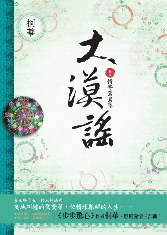 內容簡介 燃情天后桐華,繼《步步驚心》後又一燃燒愛情的《大漠謠》三部曲!新浪網3000萬讀者擁戴;晉江網800萬讀者點擊支持。 帝王興干戈,佳人傾城國, 曳地糾纏的鴛鴦藤,似情緣難解的人生…… 長安落玉坊出了個娘娘,成就了金玉聲名鵲起的坊主身分, 也讓她真正捲入宮廷政爭的一潭深水。 而慾望真能吞噬人心,昨日還是知己,今朝便能倒戈。 李妍一心奪嫡干政,卻因金玉、孟九、霍去病三人間的複雜糾葛而起了猜忌。 於此同時,漢朝對匈奴用兵仍頻,金玉竟從石舫的異常動作中, 發現九爺與西域諸國不尋常的連繫…… 世局詭譎多變,誰是誰的棋,誰承誰的情,早已牽扯不清。 名利從來都不是她心之所向,然而面對李妍的猜疑心計, 九爺似有苦衷的若即若離,還有霍去病不到心死不放手的執著,金玉又該如何抉擇? 「願得一心人,白首不相離。」 有了一點火苗,就會渴求更多溫暖。 她已流離得太久,只渴望來年花開,與那人共賞一院鴛鴦共舞, 然則心悅君兮君可知?她心心念念的歸所, 該是竹館深處一曲笛聲,抑或大漠草原同騎馳騁?