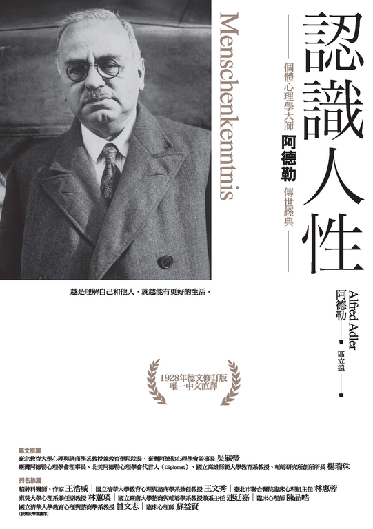 內容簡介 本書不提供試閱"「越是理解自己和他人,就越能有更好的生活。」◆個體心理學大師阿德勒最膾炙人口的經典作品◆理解阿德勒學說的第一本書◆1928年德文修訂版中文譯本希臘德爾斐阿波羅神殿入口,刻著一句著名的箴言「認識你自己」(gnothi seauton),那是人們終其一生都在追尋其答案的課題。人一生的際遇,無論是家庭、婚姻、職場或社會生活,遭遇到種種放不下也想不開的煩惱、糾葛和挫折,如果不從認識人性著手,探究其性格形成的源頭,就永遠找不到解答。個體心理學家阿德勒認為,人的性格不是天生或遺傳的,而是在成長過程中,依據其人生目標,逐步發展而成,因此也不是固定不變的。人從孩提時候,就會因為身體構造和環境的問題心生自卑感,而克服這個自卑感就成了一生中最重要的目標。如果因為人的好勝心和虛榮心作祟,使得心理發展轉向對於權力和認可的渴望,便會導致性格上的種種偏差,一輩子困擾著人們。而探究這個性格發展的偏差,讓人認識到生命的另一個重要動力,也就是社會情感,並且擴而充之,才能使人的生活回到正軌,和自己的生活和解,建立更充實的人際關係。「認識人性」是阿德勒在維也納社區大學開設的課程,每學期都有五百多個學生選課,一九二七年整理講座內容出版後,更成為全球暢銷書,也是阿德勒最家喻戶曉的作品。阿德勒一生主張「心理學要為生活和生命服務」,《認識人性》正是這個主張的代表作。【專文推薦】吳毓瑩 臺北教育大學心理與諮商學系教授兼教育學院院長、臺灣阿德勒心理學會監事長楊瑞珠 臺灣阿德勒心理學會理事長、北美阿德勒心理學會代言人(Diplomat)、國立高雄師範大學教育系教授、輔導研究所創所所長【列名推薦】(依姓氏筆畫排序)王浩威 精神科醫師、作家王文秀 國立清華大學教育心理與諮商學系兼任教授林惠蓉 臺北市聯合醫院臨床心理組主任林蕙瑛 東吳大學心理系兼任副教授連廷嘉 國立臺南大學諮商與輔導學系教授兼系主任陳品皓 臨床心理師曾文志 國立清華大學教育心理與諮商學系教授蘇益賢 臨床心理師「理解人性」是阿德勒大師闡述科學的人性知識,分析人生的美善與邪惡面向,強調人是社會動物,而意識則是人格的中心,除了內在的心理動力外,個體的人際關係,在家庭、學校或團體中都非常重要。這是一本促進自我了解與成長的寶典,也是心理諮商/家族治療的指南。——林蕙瑛 東吳大學心理系兼任副教授 這本書是阿德勒大師教導大家理解人性知識的經典著作,大師所提出人的行動軸線、生命模式與生活方式,以及決定個人命運的性格論--建構人類內心世界的最強大的刺激,都是來自最早的童年時期。更強烈要求我們要謙卑地認識人性,就如同我教授的心理診斷這門科學,要學生在學習如何去了解一個人(自己和他人)時,要不斷地觀察、聽、思考(Observing, Listening, Thinking),蒐集資料才能提出假設,勿輕易下論斷。對於現今多元的社會,我們也因缺乏人性知識,在人際關係與共同生活相處上產生許多的困擾和情緒,因此若我們越能理解自己和他人,就能減少因此所造成的問題,而有更好的生活。這本書除了是對生活有裨益的心理學,也可說是心理病理的教科書,它教導我們要認識一個人的特質,才能了解外顯的病症,非常值得研讀。——林惠蓉 臺北市聯合醫院臨床心理組主任 人性是什麼?它如何影響我們各自獨特的生命?身為長期體察人性幽明交會的心理學家,我由衷推薦本書給您。——陳品皓 臨床心理師 修煉幸福的入門之道在於洞悉自己、了解別人,阿德勒的著作《認識人性》教你如何做好這門基本功夫,找到迷失的靈魂,主宰自身的命運。——曾文志 國立清華大學教育心理與諮商學系教授 原典讀起來雖較辛苦,卻讓我們更能靠近阿德勒原汁原味的思想。聽別人說不過癮,來聽阿德勒自己說阿德勒吧!——蘇益賢 臨床心理師"