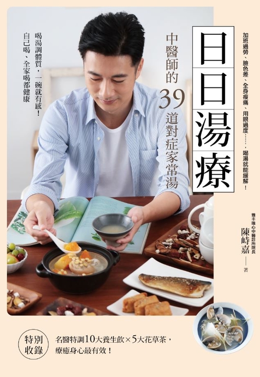 內容簡介 問問你的身體,今天該喝什麼湯?疲勞,需要補氣,羊肉湯能補氣血;有點感冒,要發汗,紫蘇湯能幫上忙長痘痘,要排濕氣,綠花椰湯去濕排毒湯,天天都要喝;喝當天身體需要湯的最好!加班過勞、臉色差、全身痠痛、用眼過度等,喝湯就能緩解,中醫師特調的39道對症家常湯,省時‧美味‧紓壓,1碗就有感,知名中醫師首度公開最有效的健康養生法,每天一碗好湯+養生茶,對症改善惱人小病痛!【39道對症湯品】中醫師才知道的獨門湯方,緩解症狀最有效,一喝就有感。【10大好食材】介紹家中要常備的好食物,搭配說明、保存方法,吃得健康又安心。【10大好藥材】精選一般人可多吃的中藥材,搭配獨門茶飲作法,喝出健康不求人。【5大療癒花草茶】特別收錄最療癒的茶飲,安定心神、解憂紓壓最有效。◆你曾想過嗎?平常喝的湯,竟有如此大的學問!本書作者陳峙嘉醫師平日忙於看診、演講、採訪、錄影,生活雖忙卻不見他有任何倦容,到底是什麼妙方讓他能保持元氣呢?答案竟然只是一碗熱騰騰的湯!陳醫師笑說,平日看診很忙碌,常常必須在很短的時間內用餐,也沒什麼時間吃點心,為了讓自己保持體力,他最喜歡「喝湯」。若覺得最近比較晚下診,他會喝「洋蔘肉片元氣湯」補充體力;長時間久坐看診難免腰痠背痛,這時他會喝「白芍排骨湯」,放鬆筋骨,看似不起眼的湯品,其實吸收了食物及藥材的精華,一碗就有感!於是每當患者來求診時,除了問診,陳醫師也會提供適合的湯方,讓患者在家就能保養身體及預防疾病,由於材料及作法簡單,讓不少患者受惠,喝過的人無不稱讚湯品的美味及療效。不過,食療方式有很多,為什麼喝湯最有效且受歡迎呢?關鍵在於:1.添加對症藥材:針對症狀加入適合的藥材,溫和不傷身體,大人小孩都可喝。2.食材隨手可得:運用家中常備的食物即可料理,容易保存及購買,製作更容易。3.料理時間短:打破長時間煲湯的迷思,只要選對食材及藥材,半小時就可完成。4.只需一個鍋子:不需更換器具,只要放入食材及藥材,用一個鍋子就能煮出好湯。◆名醫的獨門湯方,大人小孩都能喝本書收錄最有感的39道對症療癒湯品,從感冒、頭痛、火氣大等小病痛,到惱人的青春痘、掉髮、肥胖等,都能透過湯品改善,甚至自癒,包括:‧「氣色差」要吃綠花椰,【綠花椰消痘湯】改善面色黯淡‧「重感冒」要吃紫蘇,【紫蘇蛤蜊袪寒湯】治療風寒‧「惱人過敏」要吃地膚子,【地膚子減敏湯】止住皮膚癢‧「手腳冰冷」要吃麻油,【老薑麻油雞湯】暖身最有效‧「減肥」要吃赤小豆,【赤小豆消腫湯】排水又減脂◆最容易弄錯的健康迷思,一次回答除此之外,針對一般人常有的健康迷思,陳醫師也在書中一次解答,包括:‧太累就容易「爆肝」,真的嗎?‧有病治病,沒病強身,一定要貼三伏貼?‧愛喝冰飲,才是傷害皮膚的元凶?‧為什麼每天都運動,還是瘦不了?‧想大展男性雄風,不能只補腎!在本書中,除了有對症又好喝的療癒湯品外,陳醫師還要告訴你:‧為什麼要喝湯,四大好處報你知‧這樣喝湯最有效!五重點首次公開‧換季狀況多,用一碗好湯緩解不適‧心情煩悶時,療癒身心的五大花草茶‧如何挑選及保存食材,一次完整說明每天一碗熱湯加一杯養生茶,健康不求人,讓食物成為你最好的醫生!【本書特色】作法簡單:沒有複雜程序,只需一只鍋子,放入食材及藥材,一鍋美味好湯即完成。圖片精美:知名攝影師掌鏡,忠實呈現湯品樣貌,色香味俱全。藥食同源:精選藥材及食材,同時融合營養及效用,輕鬆喝出健康。
