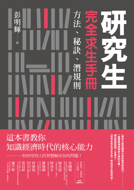 內容簡介 如何用別人的智慧解決你的問題!《生命是長期而持續的累積》作者彭明輝新作,教你掌握知識經濟時代的核心能力 彭明輝〈學術文獻回顧與分析的程序與技巧〉,一篇震撼海峽兩岸大學的文章,網站點閱超過100萬次!北京四大高校的博士生為它舉辦了一次跨校討論會,一個學術研討會將它印給全體與會者。新竹的國立交通大學圖書館連續兩年邀彭明輝演講並錄影,很多實驗室都把這錄影帶列為「新生必看」。本書《研究生完全求生手冊:方法、秘訣、潛規則》即由該文延伸而成,是國內外指導教授不會教、攸關碩博士生研究成敗的要領!用別人的智慧,解決自己的問題 彭明輝《研究生完全求生手冊》的寫作目標聚焦在碩、博士生所需要的基本能力,以及畢業前所需要的研究方法、訣竅與潛規則,而不奢談更高深的創意或研究方法。此外,為了讓這些方法易學、易用,彭明輝還把不可捉摸的研究方法與創意精煉成一套「研究工作DIY」的分解動作,引導讀者由淺入深,逐步掌握文獻回顧、批判性思考與創新的要領,讓他們可以只靠前人的智慧就生產出不錯的碩士論文,但又為讀者的個人天分保留充分的發揮餘地。最重要的是這項研究能力還可以轉化為終生受用的核心能力,讓你的工作、人生邁向更高的境界。本書最佳使用指南 《研究生完全求生手冊》有兩種可能的用法:其一碩士生自己培養研究能力或博士生和研發工程師提升研究能力的工具書;其二是研究所新生訓練或企業界研發單位新人訓練的教材。起步第1章介紹研究所可以學到的能力,以及它們如何讓人「終生受用」;第2章區辨學術論文的良窳,讓讀者知道自己要找的是怎樣的「金礦」;第3章將研究工作分成十三個主要步驟,並且建議一個工作進度表,供讀者參考。如果把研究工作比喻為一趟探險之旅,這三章合起來等於是「行前說明」。如何進行研究工作 第4章談如何選指導教授;第5章到第16章討論選題、總覽式文獻回顧、彙整批判性思考的要領與原則、創新的策略、十倍速文獻回顧的要領、研究規劃與風險控管、盤點研究成果與鞏固深化、論文寫作,以及口試委員的期待。這十三章就是《研究生完全求生手冊》的核心。看似遺漏的一章是關於論文研究計畫書的撰寫,它是很多博士生和少數碩士生資格考的項目之一,但是絕大多數碩士生不需要寫論文研究計畫書,作者把它放在書末的〈附錄1:碩、博士論文計畫書〉。學術界、產業界如何相互為用 第17章談研究所核心能力在職場與人生重大事件裡的轉化與活用;第18章談台灣這種後進、小國較適用的低成本、低耗時、低風險、高產出研發策略;第19章討論學界如何跨越產學鴻溝。這本書所介紹的研究能力不僅對研究生有用,還可以轉化為對台灣產業界與制度設計非常有參考價值的能力,用以促成產業升級。《研究生完全求生手冊》下筆力求流暢、易懂,用具體案例來深化讀者的吸收。本書強調方法論層次的觀念、要領和潛規則,目的在掌握建立讀者文獻回顧、自我批判與創新的能力,並且避免用瑣碎的技術性細節和規範來糾絆讀者的理解。※學術界‧產業界大力推薦治學的人,世界很小,也很大。說小就是研究室,說大卻是全世界,彭教授的書,告訴我們如何享受那個大世界。──朱國瑞(中央研究院院士,台大物理系特聘研究講座教授)彭教授這本書的重點不在於文憑高分、也不在於如何進入有名的公司。它是一本透過科學精神、科學方法教導如何培養自我能力與獨立思考的書。──楊光磊(台積電研發中心處長)《研究生完全求生手冊》撰寫雖從研究生角度出發,一般企業的產品或技術研發部門,若能依循本書的DIY技巧詳實操作,相信在新產品的開發上也能獲得極大的助益。──柯茂全(四零四科技公司董事)《研究生完全求生手冊》是一本一步步協助你學習的優異指南,讓你除了順利得到一紙文憑當作事業的敲門磚,還真正掌握探索新知的信心和力量。──黃貞祥(清華大學分子與細胞生物研究所助理教授)每當有研究生問我關於學術文獻分析與論文題目選取等問題時,我總是推薦他們閱讀彭老師準備給他的實驗室學生的文件。如今彭老師將這些文件內容擴充並且彙整成為專書,……書中雖然是以理工科系作為範例,然而同樣適用於數量方法取向的經濟與財金科系的研究生以及研究人員。──何泰寬(清華大學計量財務金融學系教授)如果我在出國前就讀過這一本書,將會更懂得如何選學校、指導教授與研究題目,不會因為太在意獎學金而失去許多更好的機會。假如我在博士畢業前就讀過它,選擇職場跑道時會有更好的判斷依據,而不會浪費許多時間。──廖瑞蘋(矽谷科技公司Cisco前資深研究員)彭教授傾盡畢生研究、教學與產業心得,從「探索求知」一路到「務實應用」,所有心得與方法,都灌注到這本書中。字字金玉,篇篇深刻。──謝宇程(多年研究教育、人才培育的專欄/書籍作家)
