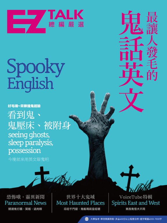 | 簡介 / | 最讓人發毛的鬼話英文:EZ TALK 總編嚴選特刊(1書1MP3) (電子書):撞鬼經驗談X全球鬼節鬼怪大集合X世界十大鬼域近距離認識妖魔鬼怪從太平間到墓仔埔都敢聊 聽鬼故事學 |