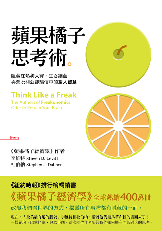 內容簡介 《紐約時報》排行榜暢銷書《蘋果橘子經濟學》全球熱銷400萬冊, 改變我們看世界的方式,揭露所有事物都有隱藏的一面。 現在,「全美最有趣的腦袋」李維特和杜伯納,帶著他們最具革命性的書回來了! 一樣銷魂、幽默怪誕、與眾不同的說故事和舉例方式, 不一樣的是,這次兩位作者要教我們如何擁有才智過人的思考。 ●●「這本書將改變你的人生。」──倫敦《每日快報》(The Daily Express, London)●● 有「全美最有趣的腦袋」美稱的李維特和杜伯納,在超級暢銷書《蘋果橘子經濟學》裡顛覆了我們看世界的方法,並剝解所有事物隱藏的一面。這次,他們提供一套重新訓練大腦的創意思考術,幫助你我超越自我,想出更精彩的解方。 從商界、運動、政治到人道慈善領域,書內所有討論只有一個主要目標:幫助你跳脫傳統思維所導致的謬誤,採用「蘋果橘子思考術」,讓生活變得更有趣、更富創意、更理性思考。 在這趟重塑大腦的過程中,你會了解斯文、瘦小的日本人如何打敗美國大塊頭,連續6年成為吃熱狗大賽的冠軍,也能開始體會澳洲醫生吞下危險細菌的用心良苦,更能欣賞奈及利亞詐騙信強調自己遠從奈及利亞寫信求助的聰明之處。 什麼是「蘋果橘子思考術」?先來看看幾項重要的小技巧: 首先,面對問題時,你得放下心中的道德羅盤──因為如果你已經決定要怎麼做的話,就很難看清楚問題的真面貌。 學會說「我不知道」──除非你承認自己真的不知道,否則幾乎不可能學會該做的事。 像孩子般思考──這能讓你問出更好的問題、想出更好的點子。 成為精通誘因的大師──無論如何,誘因都是主宰這個世界的根本要素。 學會說服不想被說服的人──只因為你是「對的」,不代表別人就得聽你的。 了解放棄的好處──如果你不願意放棄今天的死局,怎麼解決明天的問題? 兩位鬼才作者看世界的方式,明顯與眾不同,現在你也可以培養這種態度。 從來沒有這類卓越的思想家如此挑戰我們的思維,而且還這麼有趣!媒體推薦 「精彩絕倫的一本書,充滿不可思議但引人入勝的歷史細節,讓兩位作者不同於一般的流行社會科學家。」──《紐約時報》(The New York Times) 「真是太天才了……令人驚奇、拍手叫好。」──《華爾街日報》(The Wall Street Journal) 「我們現在全都是『蘋果橘子思考術』的一員。」──《華盛頓郵報》(The Washington Post) 「歡樂無窮的閱讀時光……真是令人銷魂的一本書。」──麥爾坎‧葛拉威爾(Malcolm Gladwell),暢銷書《引爆趨勢》、《以小勝大》作者 「用華麗風格說出……好觀念。」──《金融時報》(The Financial Times) 「花一個下午讀李維特與杜伯納的書,你將成為當晚滿屋子裡最有趣的人。」──美國全國公共廣播電台(National Public Radio) 「令人讀來欲罷不能的一本書,普羅大眾的速成經濟學應用。」──影音俱樂部(The A.V. Club) 「引人入勝,趣味十足。」──《紐約郵報》(New York Post) 「這本書將改變你的人生。」──倫敦《每日快報》(The Daily Express, London) 「這是兩位作者目前為止影響最重大的一本書,有著招牌的迷人故事,以及跳脫傳統的分析,帶大家進入他們的思考過程,教所有人以更具生產力、更有創意、更理性的方式思考,也就是『蘋果橘子思考術』。」──Bookreporter.com