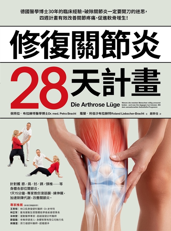 內容簡介 "德國醫學博士30年臨床經驗,破除關節炎一定要開刀的迷思千人實證,進行28天修復計畫即能避免關節磨損、促進軟骨再生,終止關節疼痛!★風靡歐洲,德國亞馬遜健康醫療暢銷NO.1★30年的專業研發,治療了數以千計的患者★簡單易學,全彩圖真人示範臺灣每年有超過2萬人進行人工膝關節手術,7成民眾有關節疼痛問題。以往認為隨著年齡、體重,關節使用次數的累積,軟骨會隨之磨損與退化,不得不進行治療甚至開刀。但為何有些人有軟骨磨損的問題,卻能毫無疼痛的過完一生?而有些人的軟骨明明完好如初,卻會感到疼痛?◎全面破解你對關節炎與關節疼痛的迷思──【迷思1:老了關節就一定會卡卡、疼痛?】有些高齡長者爬山慢跑都不是問題,有些人不到五十歲蹲下卻站不起來,年齡不是造成關節問題的主因,缺乏正確保養觀念才是。關節會疼痛不全然是關節老了、退化了,而是該部位的肌肉緊繃、筋膜缺乏彈性且沾黏,因此壓迫軟骨、造成磨耗、產生疼痛。【迷思2:關節痛,吃藥止痛直接又有效?】不管是貼貼布還是吃消炎止痛藥,都只能暫時緩解疼痛,就跟牙痛一樣,還是得需針對患部進行處理,才能有效獲得改善。吃藥止痛只是把疼痛警訊壓下去,還可能造成關節惡化。【迷思3:關節會痛是因為使用過度,盡量少動就不會痛了?】很多人整天坐著、很少運動,卻有關節疼痛問題;有些人關節疼痛就盡可能少動,以為能減少關節磨損與疼痛。但是,「活動」並不會磨損關節,反而能重建關節,運動有助於關節與軟骨健康,所以要學習讓關節得到修復強壯的運動,而非不動。【迷思4:關節疼痛退化,只能動手術換人工關節?】很多人即使不想換人工關節,但是最後會因受不了疼痛而動了手術,然而即使換了人工關節疼痛仍然不會消除。其實大部分的疼痛都能透過運動減輕過度緊繃的肌肉,進而改善。因疼痛而想換人工關節的患者,請先試試本書的修複計畫吧!◎28天關節修復計畫:根除疼痛,重建軟骨針對14個關節部位,一天15分鐘,只要4週便能緩解關節軟骨所承受的過大壓力,並使軟骨進行再生。1.∥強化關節靈活的伸展運動∥─ 針對患部的筋膜伸展,專屬運動三步驟輕鬆學會!不只要伸展肌肉、筋膜、經絡,還要反向伸展身體的每一個部位,以避免產生僵化並導致關節活動的角度受到限制。找回失去的完整關節活動角度功能,才能永遠擺脫關節疼痛。2. ∥改善關節疼痛的筋膜按摩∥─特殊手法和技巧,教你使用輔具,自己也能鬆筋膜 !滾動式筋膜按摩有兩個目的,一是推動身體中的組織液,讓筋膜網絡吸收到新的養分,並代謝老舊廢物。其二是要使纖維母細胞的纖毛解除沾黏的筋膜,藉其解決筋膜過度收縮與失去彈性的問題,達到放鬆的效果。3. ∥自我居家照護∥─調整飲食,補充增生軟骨的營養素解決其他形成疼痛的間接因素,從營養、心理、環境層面下手,調整飲食、提供料理食譜,攝取有效增生軟骨的營養素,並且調整情緒及環境中各形式輻射能量、化學物質的影響。◎案例分享1.【90歲高齡無需換人工關節,也能健步如飛】作者羅蘭的母親在70歲的時候換了人工髖關節,本來預計還需再換另一組人工關節,自從定期做了此書運動,順利擺脫關節炎與關節疼痛,即使現齡90歲依舊行動無阻。2.【嚴重O型腿,一年見效】本身是名物理治療師,卻有第四級的關節炎與嚴重的疼痛問題。在進行完首次的訓練後,將疼痛程度減至原先的十分之一,持續一年多後,原本相距11公分的膝蓋已經可以靠攏,甚至快跑也不是問題。3.【需服用強效止痛藥患者,獲得改善】一名嘗試過無數正規醫學療法(如物理治療、手法治療),仍幾乎無法行走的患者,在接受訓練計畫後獲得改善。4.【有效放鬆膝關節,免除開刀裝支架】實證結果顯示,透過訓練讓大腿與小腿間關節空隙平均增加了兩公釐,有效放鬆緊繃的膝關節、確實舒緩受到壓迫的軟骨。◎ 本書特色• 找出關節磨損、疼痛的真正原因• 打破一定要換人工關節的迷思• 破除軟骨不能再生的觀念• 跳脫治標不治本治療方式◎專業推薦脊椎保健達人、身體智慧有限公司執行長/鄭雲龍 運動醫學專家、超越復健診所/凃俐雯醫師林口長庚復健科/王思恒(史考特)醫師臺灣運動生理暨體能學會創會理事長/林正常原力復健科-超級鐵人/侯鐘堡醫師 ◎好評推薦「本書引導您從消極的關節炎治療,轉變成積極的創造自己的健康!」──脊椎保健達人/鄭雲龍「基於作者數十年的實務驗證,本書除描述關節炎的相關知識外,主要針對各不同部位關節,指導伸展與滾動式筋膜按摩的運動技法,值得參照練習,以減緩甚至解除痛楚。」──臺灣運動生理暨體能學會創會理事長/林正常「關節炎要開刀?落伍囉!本書有你需要知道關節炎的一切!」──原力復健科-超級鐵人︳侯鐘堡醫師"