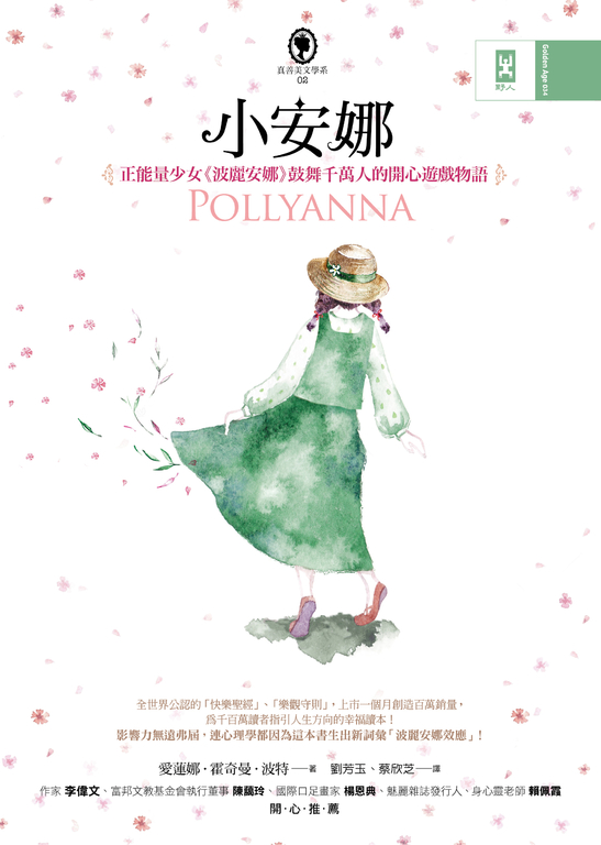 內容簡介 內容簡介 全世界公認的「快樂聖經」、「樂觀守則」,全美上市一個月創造百萬銷量,為千百萬讀者指引人生方向的幸福讀本! 影響力無遠弗屆,連心理學都因為這本書生出新詞彙「波麗安娜效應」! ▍不幸的事有千千百百種,但只要有波麗安娜的開心妙方,每天都可以快快樂樂的過!▍ 十一歲的波麗安娜在失去父母之後,被送去和素未謀面的波麗姨媽同住,雖然波麗姨媽總是以冷漠嚴厲的態度對待波麗安娜,但她依舊憑著父親教給她的「開心遊戲」得到身邊所有人的喜愛,也為小鎮上有各種不幸的人們帶來快樂。 然而,總是用各種神奇想法為大家找到開心理由的波麗安娜,當她自己遭遇不幸時,是否也能用「開心遊戲」療癒自己呢? 波麗安娜美麗純真的故事向我們顯示了快樂的力量,也教導我們該如何保持樂觀的心態,先從自己出發,才能成為這個世界快樂的源泉。名人推薦 李偉文 作家 陳藹玲 富邦文教基金會執行董事 楊恩典 國際口足畫家 賴佩霞 魅麗雜誌發行人、身心靈老師