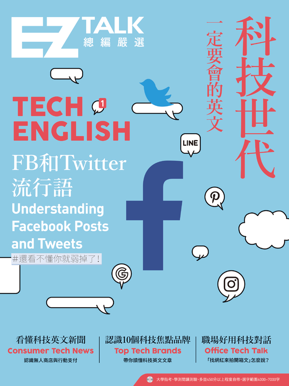 產品目錄 特別企劃:A Short History of Social Media社群媒體演變史(文章閱讀+單字)Social Media—Let’s Get Social!社群網站 大家一起來哈啦吧!(好用例句+單字介紹+會話)Understanding Facebook Posts and Tweets看懂FB和twitter貼文(單字介紹)Tech Words科技衍生字(單字介紹)All About Cell Phones手機相關用語怎麼說(單字+句子+會話) Part 1生活科技新聞 Consumer Tech News(閱讀+對話+單字) 1.Robots Replacing Waiters at Alibaba's Robot.He Restaurant里巴巴的機器人餐廳以機器人取代服務生2.Make Fitness a Priority This Year with a New Fitness Tracker今年就用新的健身追蹤器,將健身列為頭等大事3.Taiwan Slow to Adopt Mobile Payment臺灣採用行動支付速度緩慢 4.New Companion Robots Show Promise新陪伴型機器人前途無量5.The Latest in VR Tech最新的虛擬實境科技 6.Is Your Smartphone a Pain in the Neck? 你的智慧手機會造成肩頸痠痛嗎? 7.Burnout Common Among Top YouTubers職業倦怠是YouTube熱門網紅的常見現象 8.Facebook’s Latest Privacy Scandal臉書最近的隱私權醜聞9.CRISPR Gene-edited Baby Project Declared Illegal當局宣布CRISPR基因編輯嬰兒計畫屬違法10.Taiwan Warming Up to Blockchain臺灣逐漸接受區塊鏈 Part 2職場科技對話 Office Tech Conversations(會話+單字) 1.Putting Together PowerPoint Presentations 整理投影片簡報2.A Multifunction Printer to the Rescue! 用多功能事務機來解救3.Making the Case for Macs 說說蘋果電腦的優點4.Problems with Pirated Software盜版軟體的問題5.How to Drive Facebook Traffic 如何增加臉書流量6.Marketing with YouTube 用YouTube行銷7.Learning to Use the Cloud 學習使用雲端8.Getting Organized with Google Sheets 用Google試算表讓工作井然有序 Part 3科技焦點品牌 Top Tech Brands(閱讀+閱讀測驗) 1.Amazon—Selling to the World亞馬遜:賣到全世界 Jeff Bezos傑佛瑞貝佐斯2.Facebook—A Social Network Goes Global臉書:使用者遍布世界的社群網站 Mark Zuckerberg馬克祖克柏 3.Apple—the Company that Made Tech Fashionable 蘋果公司:讓科技變時尚的公司 Tim Cook提姆庫克 4.Google—the King of Search 谷歌:搜尋之王 Larry Page and Sergey Brin 賴利佩吉和謝爾蓋布林 5.DJI—the First Chinese Global Brand 大疆創新:中國第一個全球品牌 Frank Wang 汪滔6.Alibaba—Opening Doors for Businesses and Consumers阿里巴巴:開啟企業和消費者之間的大門 Jack Ma馬雲7.Netflix— A New Way to Watch Movies網飛:觀賞電影的新方法 Wilmot Reed Hastings, Jr. 威摩里德海斯汀二世 8.Airbnb—Feel at Home While Traveling Airbnb民宿網站:讓旅客賓至如歸 Brian Chesky 布萊恩切斯基 9.Tesla, Inc.—Leader in Electric Cars 特斯拉:電動車的領導者 Elon Musk 伊隆馬斯克 10.Uber, the Ridesharing Giant 優步:共乘鉅子 Dara Khosrowshahi達拉柯霍斯洛夏西