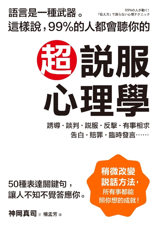 內容簡介 「語言」是最強的武器。改變說話方法,所有事都能照你想的成就。 誘導‧談判‧說服‧反擊‧有事相求‧告白‧賠罪‧臨時發言……人生有太多重要時刻需要發聲,但我們常因緊張搞砸。只要洞悉「人性」,就能驅使別人照你的想法行動,不費吹灰之力心想事成! ★ 50種表達關鍵句,人生從此改變! ‧想讓對方「越說越多」你該怎麼說? ‧搞定情緒化、脾氣差的人,悄悄拉攏對方 ‧不管要求多不合理,都能讓對方答應 ‧上司命令也可拒絕的「終極拒絕法」 ◆「超說服」關鍵:從心理學切入,說話就能很動聽! 說服他人,並不是自己在內心琢磨就能成功。因此很多「話術」的背後,其實是心理技巧的運用。這些技巧非常簡單,簡單到根本不用刻意學習,自己就會有相同的想法,只是我們說話時常因心急忘記。 心理溝通專家精選出50招「成功說服的本事」,舉出在生活中已察覺或未察覺的表達技巧,帶入心理學理論加深印象,讓人可以「直覺」猜到對方的想法,根據這點去回話便能置入自己的意圖影響對方,100%達成說服目標。 ●「製造好感」的心理技巧 「24小時之內回覆您」→給人很迅速的印象。 「查了之後,明天之前回覆您」→給人的印象普通。 換一種表達方式,可以得到更多盟軍,善用正面印象,支持者就會增加。 ●「操控他人行動」的催眠話術 A:「喂!你要捐助貧困的我三千元,還是要借我一萬元撐到發薪日?」 B:「唉,你沒別人可拜託嗎?沒辦法,我借你一萬塊,你一定要還我唷!」 強迫人從兩個不利的條件二選一時,不可思議的事情就會發生,他會去選擇對他壞處較少的條件。 ●不傷和氣,又能「加倍奉還」的反擊話術 客戶:「這次的成本,再降一點不行嗎?」 廠商:第一步【道歉】──「很抱歉。」 第二步【拒絕】──「我們沒辦法降價。」 第三步【理由】──「因為是新產品。」 心裡明明不願意卻答應對方,才是對別人沒禮貌的行為。使出「勇敢說不三步驟」話術,就能乾淨俐落地拒絕別人。 【低飛球詐術+一貫性原理】有求必應的妙招 義工:「只要十秒鐘,請幫我們署名,支持社區綠化!」 路人:「好啊,只要在這裡寫名字跟住址就可以了吧,我寫好了。」 義工:「謝謝您,另外只要捐一百元就能幫助環境綠化,請多多幫忙。」 路人:「捐款啊,好、好,一百元給你。」 用「小事」當誘餌,對方一旦回答YES,之後就很難再抽身了。 【不同調的技巧】10秒鐘平息對方的怒火 上司:「喂!搞什麼,你又闖禍了!」 下屬:「部長,請您冷靜下來。」 上司:「你說什麼?因為你事情做不好,我才要收爛攤子!你那是什麼態度!」 下屬:「部長,這裡是公司,請您說話冷靜一點。」 上司:「我可是很冷靜的……。」(被指出情緒化的現況感到不好意思) 「害怕」是配合對方的行動,叫他冷靜則是強迫他配合自己的步調,怒火自然無處可燒。 【大義名義效應】「都是為了○○」讓人無法說不 董事長:「設計有問題?你知道全面回收要花多少錢嗎?這危及到公司的經營。」 技術人員:「是、是……您說的沒錯。」 董事長:「有問題的才送到工廠維修,懂了嗎?這一切都是為了公司好!」 搬出冠冕堂皇的理由刺激對方有「使命感」,即使是為了自己,表面上也要說是「為了大家」。 【貼標籤效應】先下手為強,暗示對方該怎麼做 「楊先生很親切,常受您照顧。」今天也請多多關照 「方課長做事最果決,要麻煩您做決定了。」請立刻決定! 【NLP式名詞解構】面對別人的拒絕,推辭藉口失效 對方:「這個工作機會很難得,但我『很怕數字』,所以無法勝任這項工作。」 回話:「為什麼你會這麼想呢?」 對方:「因為以前算估價單,曾經發生好幾次數字不合的情形,而且念書時最不擅長數學。」 回話:「我想你不是害怕數字,只是不擅長精細的計算而已,這和數學思考是不同的。」 根據研究,人有很多顧慮都是幻想出來的,所以成功說服人最有效辦法就是去「問」他。 【資訊不對等性】「如您所知」輕易操控他人 「如您所知,在全球化的社會想要生存下去,除了大幅度降低成本以外,別無他法。」 以談論常識的口吻說出對方不太懂的事,對方會不好意思反駁而接受你的說法。 【認知不協調的效用】違反常理是吸睛鐵則 上司說:「不要去問顧客需要什麼!」下屬聽了會大吃一驚。 聽到上司解釋:「在問顧客的需求前,要先讓顧客了解我們對品質的堅持。」才豁然開朗。 人會忍不住被顛覆常識的說法被吸引。一旦理解原由,就會不可思議地產生高度認同。 【反問的反擊效果】「您這是什麼意思?」不再當軟柿子 A:「明知道這個要求很過分,還希望我們答應?您這是什麼意思?」 B:「嗯,不過就是希望大家能彼此幫忙共度難關,您懂我說的意思吧?」 A:「不,我不懂。以這次的下單量來說,勉強只能降個一成。」 人被問題會自動反射性想回答。因此,對方不得不暫緩攻勢,一句話就將他轉攻為守。 ◆懂得運用「語言武器」,做什麼都順利! 我們生活的每一天,其實都是由一連串的「溝通交涉」所組成的。在你的生活裡,有沒有那種「好像很難親近、感覺不對盤」的人呢?放任這樣的關係惡化,跟對方的遙遠距離感就會固定下來,彼此都會故意避開另一方。最慘的情況是互看不順眼,樹立潛在的敵人。這樣的關係,盡早修復比較保險。想馬上縮短距離,可以用下述方法主動接近對方: (1)【滿足肯定需求】請教對方跟他的