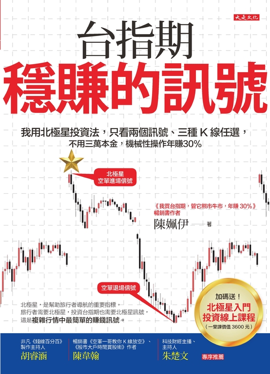 內容簡介 暢銷書《我買台指期,管它熊市牛市,年賺30%》作者新作! 36張K線圖表一次呈現,完整分析何時進場、何時退場, 給你複雜行情中,最簡單的買賣點訊號。 北極星,是最靠近北極的恆星,也是幫助旅行者導航的重要指標。 不只旅行者需要北極星,想賺錢,你也需要北極星, 因為這是複雜行情中最簡單的賺錢訊號。 因為當盤勢出現北極星訊號,代表大盤即將由漲轉跌, 此時你如果放空,就能穩賺。 指數中常見「緩漲急跌現象」,這是因為, 指數上漲就像在爬山漲勢需要用錢去堆、行情走不快; 跌勢則是資金一退就散,宛如推石頭下山,滾得又急又快, 所以投資台指期,放空多半賺得快。 本書作者陳姵伊,原本在軍醫院擔任朝八晚五的行政文書, 跟許多人一樣,看到數字就頭痛、一翻開報紙就直接跳過財經版。 十多年前她從軍職退伍後,想找一份收入穩定又自由的工作, 於是「積極」投入股市,沒想到一場金融風暴落得她滿手套牢股票, 只能認賠作收。後來,經由學習技術分析,才逐漸將虧損賺回。 直到她開始接觸台指期,發現這種投資工具漲跌容易預測、不用時時盯盤, 只要專攻一檔(就是台指期,不會滿手股票)鎖定兩種行情(漲或跌)、 年報酬率達30%以上,收入比公職豐厚,還穩定! 三年前,她將這套方法寫成《我買台指期,管它熊市牛市,年賺30%》 歸納出沒有經驗的人也能理解的123法則,被市場譽為台指期女班長。 這一回,她要分享台指期更簡單的穩賺訊號:北極星投資法 只要掌握K線圖上的兩個信號:黑K(創新高)進場、紅K(創新低)退場, 然後掌握三種頻率, 不用3萬元本金就能進場,年賺30%。 ◎我將主要投資標的,從台股轉為台指期,獲利更穩定 ‧只要研究一個標的: 台指期就是以台灣加權股價指數為投資標的期貨商品, 無論你選擇大台指(TX)、小台指(MTX),都只要研究一個標的(台指期)。 ‧不用三萬元就可投資。 台股交易以一張(1000股)為單位;台指期則以一口為單位, 又區分為大台指與小台指。以小台而言,預繳保證金26750元即可交易; 不用,3萬元就可以進場投資。 ◎北極星投資法 ──複雜行情中最簡單的賺錢訊號 只要掌握兩個信號(本書用K線全圖解) 何時進場:當台指期指數連日大漲後, 大盤當日以黑K做收(當日收盤價低於開盤價)並且創新高, 代表北極星出現了:多頭力道不足,行情將由漲轉跌。 此時你可進行放空的布局。 何時退場:當台指期指數連日大跌後, 大盤當日以紅K做收(當日收盤價高於開盤價)並且創新低, 代表跌勢即將結束,放空的你此時就該退場了。 ◎三種頻率:中、長期投資、與愛搶短線者通通適用: ‧最適合上班族的北極星日K線操作法, 給你12種日K線(一天才會出現一根)行情,讓你穩穩賺。 ‧最適合初學者練習的60分鐘K線投資法 給你12種60 K線(一小時出現一根)行情,第一次進場也能上手。 ‧不用管明天、只想賺今天的10分鐘K線快速賺錢法 作者也提供宛如極速快感的10分鐘K線圖,讓你掌握一日行情。 一種規則,兩種信號,三種頻率,搭配36張K線波段行情全圖解, 不用三萬本金就能進場,你也能年賺30%