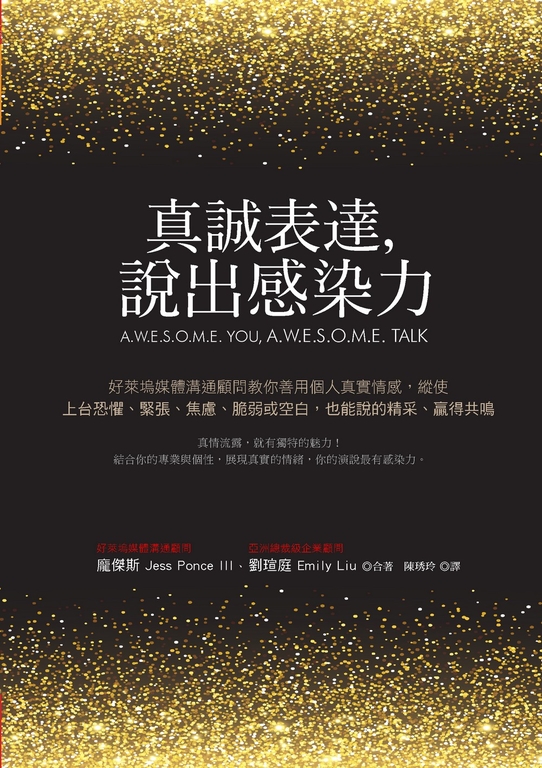 作者介紹 龐傑斯Jess Ponce III 他為盧卡斯電影公司(Lucasfilm)、迪士尼(Disney)、家園頻道(HGTV)、領英(LinkedIn)、雀巢(Nestlé)、麗思卡爾頓酒店(The Ritz-Carlton)和法國巴黎銀行(BNP Paribas)等國際知名品牌,指導高階主管、發言人和演藝人員。亦曾為《財星》(Fortune)500大企業的執行長、專業創意人士和TED演說者提供指導,加強他們在商業活動中的演說、領導力和媒體溝通能力,包括:新聞採訪、內部溝通、大型會議和商務對話等。 身為《閃耀獨一無二的你》(Everyday Celebrity)的合著者,Jess與超過2,500位名人和1,500名電視主持人、專家、作家和發言人合作。他也是媒體與溝通顧問和個人品牌專家,並獨創「A元素」(The A Factor),指導每個人發揮明星特質,展現最真實、最好的自我。 他同時是美國媒體公司JP3的創辦人,該公司致力於開發和打造,具個人魅力及企業家精神的媒體人才。與台灣渥盛集團Awesome group的創辦人暨CEO Emily聯手,為成人與青少年,創作溝通議題有關的系列課程和書籍,在台灣、香港和中國等地廣受好評。劉瑄庭Emily LiuEmily集創業家、領導者、顧問、企業教練、講者與作者於一身。她的熱情和承諾,是支持他人活出閃耀獨一無二的自己,實現夢想、利他共贏!Emily擅長開創、創新和發展學習平台,身為渥盛集團 Awesome Group 的創辦人和CEO,她引進以人本出發的體驗式學習,為個人和企業提供卓越的個人成長、領導力及核心能力培訓,始終事業界的標竿、人才的搖籃。自1996年起,在台灣已服務超過十萬人次。 2012年起,渥盛集團致力發展「Awesome商學苑」系列課程,擴大引進世界一流師資,和Emily共同研發近20個實戰實效的課程和講堂,並著有4本商管類暢銷書:由渥盛集團Awesome Group出版的有《要贏,沒有祕密》(Secrets to Winning)、《活出大師對生命的熱情與態度》(Singing in the Rain),以及由天下雜誌出版的《閃耀獨一無二的你》(Everyday Celebrity)、《真誠表達,說出感染力》(A.W.E.S.O.M.E. YOU, A.W.E.S.O.M.E. TALK
