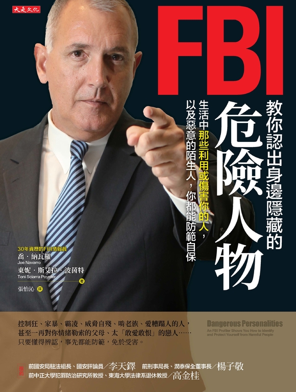 內容簡介 控制狂、家暴、霸凌、威脅自殘、啃老族、愛糟蹋人的人, 甚至一再對你情緒勒索的父母、太「敢愛敢恨」的戀人…… 只要懂得如何辨認,事先都能防範,免於受害。 繼《FBI教你讀心術》、《FBI套話術,讓他不知不覺說真話》系列暢銷百萬冊後, 專攻犯罪剖繪與非語言溝通, 擁有30年資歷的FBI資深探員納瓦羅,要以多年辦案的親身經驗告訴你: 哪些和你一起生活的人,常在利用或傷害你? 這些危險人物有哪些特徵? ◎自戀者,一點一點折磨你,偏偏法律難以約束: 控制狂、霸凌者、糟蹋人、詐欺犯、宗教領袖 這種人常說「這些年要不是我,你怎麼可能……」,靠貶低別人獲得優越感。 這種父母把孩子當自我延伸,期望看到最完美結果,並堅稱一切都是為你好。 這類領導者,像是邪教領袖,常以宗教為幌子,要求信徒無條件交託性命。 ◎敢愛敢恨?其實是情緒炸彈: 瞬間變臉、耍賴、威脅自殘、打我卻說愛我 這種人會公然測試你的忠誠度:「你支持我還是支持她?你站在誰那邊?」 擅長耍賴,讓「不行」變「好吧」,自殺或自殘不過只是威脅手段。 情緒來了,就會亂砸毀壞物品、打人或嚴厲懲罰孩子,完全無法控制。 ◎認為誰都不可信的偏執人格: 你的看法他都貶抑、對每一份工作都不滿、日常行蹤總是搞神祕 因為不相信任何人,這種人會要求家人棄絕所有社交活動。 易怒、愛比較,只要同事在說悄悄話,他們會以為是在說自己的壞話。 萬一成為領導者或官員,他們的恐懼與憎恨常常促成大屠殺。 ◎持續犯案,毫無悔意的獵食者: 黑心商人、慣犯、啃老族、吃軟飯、騙錢的親友 這種人精於哄騙、誘惑和道歉,把別人耍得團團轉。 只要能滿足欲望就會不擇手段,完全不管別人會遭殃。 要求家人作保,或進行一些看不出前景的投資,卻毫不在乎家人下場。 面對以上這四種危險人物,我們該如何保護自己? ◎每天可以做的準備: 使用本書內附的危險人格檢核表、關鍵字,提醒自己該怎麼觀察人。 相信直覺:這人給你什麼感覺?討喜不等於善良,差多了。 注意時間和地點,每天下午4點到凌晨2點,是暴力事件最容易發生的時段。 ◎危險人物就在身邊,該如何應付? 向親朋好友示警,請求專業人士幫忙,別不好意思。 擬定脫身計畫,並且存錢應急,不動聲色準備脫身。 如果無法立馬閃人,將被害行為歸類建檔,存證有備無患。 FBI資深探員納瓦羅給大家的忠言: 「你沒有義務承受折磨,也不必任由他人(包括家人)傷害。」