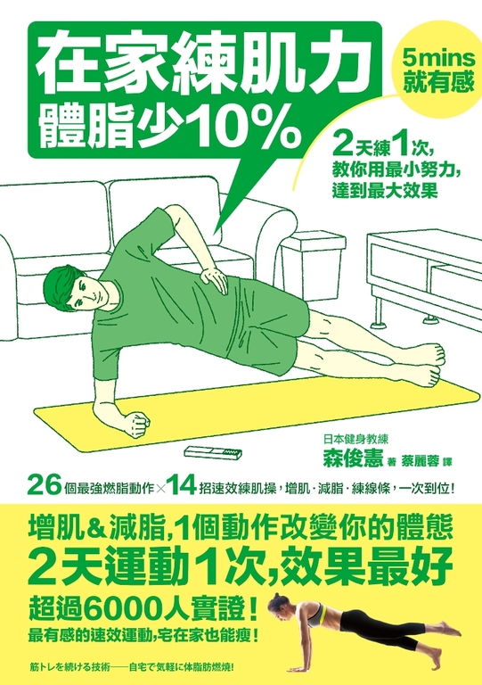 內容簡介 -2天練1次,效果最好!26個燃脂動作X 14組速效練肌操,增肌‧減脂‧練線條,一次到位!-★2天運動1次,效果最好★ ★超過6,000人實證,平均減脂10%,線條再升級★ 日本超人氣健身教練,教你「事半功倍」的增肌訓練 用「最小」 努力,達到「最大」 效果! 5分鐘,一個動作改變你的體態! 【2天練1次效果最好,人人都做得到】 ●33歲男性上班族:體脂少9%,體重減輕9公斤►腿部、腹部練出線條,衣服從2L改穿M號。 ●49歲男性上班族:體脂少12%,腰圍減少14公分►全身變得緊實,腿部變得有力,工作輕快許多。 ●30歲女性上班族:體脂少6.4%,體重減輕6公斤►身材曲線變得明顯,甚至出現頸部線條。 【強效版】五分多鐘連續動作,事半功倍訓練完成目標 辦公室運動、水蛇腰、練腹肌、肌肉猛男特訓作、瘦身迎夏天、緊實雙腿、纖細雙臂,針對最常見的目標,特別加碼2~4個動作的強效訓練。 ◆「我要瘦X公斤」的減法思考,絕對瘦不了! 你是用哪一種方式來設定肌力訓練的目標呢?若以「減法思考模式」的瘦身目標,只想著「要在幾天內瘦X公斤」或許一開始會瘦很快,卻容易在進行肌力訓練 時,倍感壓力、無法持續,受限於數字。關鍵不在於體重減輕多少,而是希望擁有「怎樣的身材」。因此,目標設定的重點請放在「肌力訓練後想獲得什麼」,具體 描繪出來,幫助你朝向目標,持續進行訓練。 ◆肌肉增加,體脂才會減少! 只要身體的體脂肪減少,身材看起來就會變得精實。想減少體脂肪,一定得透過肌力訓練,增加身體的肌肉量。一旦擁有足夠的肌肉量,身體的代謝能力會上升,就算是安靜不動,人體也能不斷燃燒脂肪。只要持續做肌力訓練,就算沒有進行激烈運動,熱量的消耗也會增加。 【26個燃脂動作X 14組速效練肌操,增肌‧減脂‧練線條】 ◆利用生活空檔鍛鍊,5分鐘就有感 本書精選26種燃脂動作,每天只要5分鐘,靈活運用空暇時間,就能將肌力訓練巧妙融入日常生活中,生活型態既不會出現太大變動,做起來也倍感輕鬆無壓力。不管是腹部、腿部、胸部、雙臂,都能依照你的目標量身打造,有效改善在意部位。 ◆配合生活作息,善用零碎時間健身 想要打造理想體態,必須搭配組合動作,同時訓練多處肌肉。本書搭配14種「速效練肌操」,不管是想趁著上班午休、影印文件、周末休假、或趕在夏天來臨前完成訓練,一週只要進行2次以上,就能打造完美好體態。 【一次破解肌力訓練的迷思,觀念正確了,訓練才有效】 Q:想要有好身材,一定要做肌力訓練嗎? A:身材曲線走樣、變得鬆弛,主要原因是肌肉的肌力變弱,導致體脂肪增加。唯有透過肌力訓練,增加身體的肌肉量,才能減少體脂肪、塑造優美的身材曲線。 Q:我已邁入中年,還能練出肌肉嗎? A:人體的肌肉非常單純,只要給予適當的刺激,就會開始變得強壯。因為肌肉的生長沒有年齡限制,縱使年過六十,只要從現在開始做肌力訓練,就能打造理想身材。 Q:我常加班,無法定時做肌力訓練,怎麼辦? A:遇到這種情形,千要不要勉強自己,不妨休息一下,這就是持之以恆的祕訣。真的感到精疲力盡時,休息一下也無妨,一、二天不想鍛鍊肌肉,並不會造成太大影響,想做時再繼續就好。 Q:想增加肌肉,一定得增加訓練次數嗎? A:當進行同一個動作超過一定次數後,身體將轉為訓練肌肉的肌耐力,反而無法達到「增肌」的目標。與其增加次數,不如改變動作的角度,以提高負荷,讓身體有感覺即可,效果反而更好。 Q:只要有活動到身體,就是有效的肌力訓練? A:一開始就要先練習正確的姿勢,否則就算運動時滿身大汗,肌肉很痠痛,也會因為姿勢錯誤,無法達到鍛鍊效果,久而久之,反而容易造成肌肉傷害。 ◆除了學會正確肌力訓練,本書還要帶給你: 全身肌肉圖解:了解身體肌肉的構造,才能明白正在進行的肌肉訓練,能強化哪些部位的肌肉。 體力級數測試:附兩種體力測試法,每個月定期測試一次,能知道自己進步多少,增加動力。 真實案例分享:不同生活型態的讀者分享各自的成功經驗,加強大家對這套訓練的信心與肯定。本書特色 ◆CP值最高 肌力訓練不需要運動到滿身大汗,或是全身痠痛。只要掌握到正確姿勢,對肌肉施加適當的負荷,就算在短時間內進行,都能夠增加身體的肌肉量、減少體脂肪。 ◆最省時省事 因為在家就可以練肌力,不需要特別花時間換衣服到健身房,因此無論時間地點,只要想訓練,隨時都可以進行,省時也省事。 ◆最輕鬆自在 不擅長運動的人,還有對體力沒自信的人,可能會不習慣在眾人面前訓練,但若是在家裡進行,就不必顧忌他人眼光,可以輕鬆自在地著手訓練。