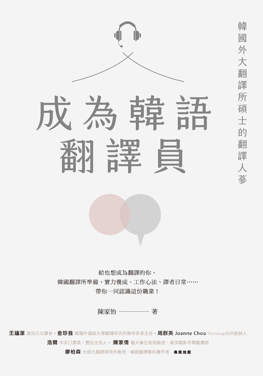 內容簡介 給也想成為翻譯的你。翻譯所準備、實力養成、工作心法、譯者日常……透過韓國外大翻譯所碩士的人生,帶你認識「韓語翻譯員」這份職業。我現在在學韓文,之後可以去當翻譯嗎?該不該去韓國考翻譯所?韓國翻譯所跟台灣的韓文所有什麼不同?翻譯工作要去哪裡找?如何加強自己的翻譯能力?我適合「翻譯」這份職業嗎?沒有受過專業訓練的人該怎麼起步?讀完這本《成為韓語翻譯員》,你將有所領悟。★從非本科生到成為專業翻譯員本書作者陳家怡畢業於韓國外國語大學翻譯研究所,然而她並非韓文系出身,經歷了短期留學、語學堂與研究所等諸多過程,才成為一名專業翻譯員。作者將自己一路上的韓語學習經驗、練功技法與工作見聞等,以溫柔誠摯的筆觸書寫出來,公開這趟追夢旅程,帶領讀者一同認識「翻譯員」這份職業。★韓國翻譯所都在學什麼?書中簡單介紹韓國外大、梨大、中央大與首爾外大四間韓國主要的翻譯研究所,針對作者就讀的外大,從備考、面試、學校課程到畢業考都詳細記錄。並分享外大「聽說讀寫」練功方法,例如「聽力」除了要能聽懂對方在說什麼,更需要短暫將內容記住並翻譯,於是做「記憶訓練」就格外重要。除此之外,還教你視譯、跟讀、筆記、讀書會等具體練習做法,完整呈現專業翻譯員的實力養成之路。★翻譯員都在做什麼?──明明說好只做隨行口譯,卻突然被叫上台當逐步口譯?──花了一個月準備好的資料,翻譯當天才收到更新版簡報?!工作有好有壞,翻譯工作也時常遊走在驚喜與驚嚇間。書籍第三章分享了作者的口筆譯工作案例,不過度詮釋或修飾這份職業,而是如實地透過各式各樣的實務經驗,帶你了解翻譯員的日常,並透過作者的實戰經歷一窺業界實態。【本書特色】1. 公開韓國頂尖翻譯所的訓練方法,能運用此套練功心法,以提升自己的翻譯實力。2. 透過業界案例,了解翻譯員多樣的工作類型與日常。3. 各章節末整理出對「翻譯」的常見疑問,舉凡如何入行、被拖欠稿費時怎麼處理、自主練習時,怎麼知道自己的翻譯是否正確等等,提供讀者實用的建議。4. 作者以溫暖樸實的文字,毫無保留地分享自身人生。不論是對未來感到迷惘、渴望轉換跑道或懷疑自己是否真能實踐夢想的人,都能從中獲得一些啟發或力量。專業推薦(以姓名首字筆畫排序)王蘊潔|資深日文譯者金珍我|韓國外國語大學翻譯研究所韓中系系主任周群英 Joanne Chou|Termsoup共同創辦人浩爾|中英口譯員、雙語主持人陳家倩|臺大兼任助理教授、資深電影字幕翻譯師廖柏森|台師大翻譯研究所教授、暢銷翻譯教科書作者書中從家怡第一次接觸韓語的感受,到準備翻譯研究所入學考試的過程,一直到在校生活和韓國翻譯研究所課程分享,並談到一些自身工作經歷,最後撰寫成一本既實用又吸引人的書籍。在書中,她以誠摯的筆觸,將學習過程中的甜、酸、苦、辣娓娓道來,還坦率地談到譯者面對自動翻譯的心態。書中描述了韓語學習與翻譯訓練的精彩片段,同時帶讀者深入了解翻譯領域的諸多問題與現象,我相信這本書一定能成為韓語翻譯學習的最佳參考書,也期待讀者們開闢出屬於自己的翻譯新天地!──金珍我(韓國外國語大學翻譯研究所韓中系系主任)在台灣,大部分談翻譯學習的書都以英文為主,其次是日文,如果講到翻譯的職涯發展,則更是如此。這幾年台灣學韓文的人越來越多,韓文翻譯的需求也越來越旺,家怡的書正好填補了韓文的空缺。我相信很多人正苦於沒有太多前人的經驗可以參考,家怡的書不僅是恰到好處的參考,而且是很厲害的參考。──周群英 Joanne Chou(Termsoup共同創辦人)一直以來,大眾始終不太認識口譯員,印象模糊:或許是講者旁邊的影子,或許是耳機裡的聲音,或許是口譯廂裡的工作人員。我長期經營「會走路的翻譯機」形象,心中期盼大家更認識譯者。欣見此書詳實呈現專業的養成,提升讀者對翻譯的認知,更讓有志投身此道者有所依循,彌足珍貴!我與作者語組不同,卻是廣義的同事,都是「譯家人」,期待將來或有機會在隔壁口譯廂共事,搭建國際溝通橋樑。──浩爾(中英口譯員、雙語主持人)作者從國內英文系轉戰韓國翻譯研究所,歷經挫折、最終躋身國際會議口譯員的行列,其追求「非我不可」的人生故事,令人動容。書中也分享了韓外大翻譯所的嚴格訓練過程,以及在台韓業界接案的實務歷練,可說是國人赴韓國攻讀翻譯、成為中韓譯者的最佳指南。──廖柏森(台師大翻譯研究所教授、暢銷翻譯教科書作者)