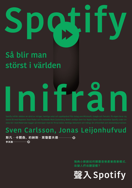 內容簡介 全球最大音樂串流平台首本傳記Spotify創業歷程全紀錄 在Spotify出現之前,沒人想得到既可以免費提供合法音樂,又能從中獲利的方法;用戶首度享受到獨一無二的音樂體驗,藉由量身打造、自動根據喜好建立播放清單的服務,人們更容易接觸到新創作者以及新歌。其中最令人驚豔的,是Spotify流暢且近乎毫無延遲、音質還能維持一定水準的技術,甫推出便風靡了整個科技圈。 短短十年間,這家瑞典小新創不僅大幅解決盜版問題,更改寫了傳統音樂產業的唱片銷售商業模式,迫使蘋果改變在音樂市場的戰略布局,連Google和微軟都搶著要買下它,Facebook更和它跨界合作,公司市值直逼成衣業龍頭H&M——但你知道嗎,Spotify在這創業的十五年間始終沒有賺進半毛錢,這中間究竟有何祕辛? 瑞典科技線記者斯凡.卡爾森與約納斯.萊瓊霍夫德除了蒐集整理Spotify內部文件、年度報告與各界報導,更訪談70多位相關人士,涵蓋Spotify重要職員與董事、科技業創投、在音樂產業中握有決定權的人,甚至包含競爭對手。從構思到創辦公司,一路成長至服務擴及79個國家、用戶數突破3億,作者詳細描述Spotify如何和唱片大廠斡旋談妥授權;調解大牌歌手與創作者的抗議聲浪;在內有高層對公司發展抱有歧見、外有其他音樂串流平台夾殺中生存,更收錄首度公開的獨家內幕「Spotify TV」專案詳情,完整描繪了Spotify的生命史。 從小蝦米變成大鯨魚, 全球最大音樂串流平台的幕後故事,本書帶你一一解密!本書特色 1. 第一本Spotify傳記,不僅補足市場缺口,在 Spotify十五週年出版也深具紀念意義。 2. 細說Spotify的創業歷程、其中遭逢的各種困難阻礙,十分詳細地描寫該公司要角群的處事風格及與競爭對手的角力關係,內容精采且引人入勝。 3. 內附創始團隊合照與Spotify各個重大里程碑紀念照,配合內文閱讀更能融入其中。專業推薦 陶韻智/XRSPACE 總經理、德豐管理顧問公司合夥人 黃子佼/作家、樂評人 盧希鵬/臺灣科技大學資訊管理系教授 ——依姓氏筆畫排序—— 國外好評 「這兩位傑出的瑞典記者細述Spotify歷史性的崛起,該公司顛覆現代音樂面貌的過程不僅是令人驚嘆的商業奇談,更是一門可以從中探究科技地緣政治的學問。Spotify創辦人之一丹尼爾.埃克印證了矽谷未必總是贏家的道理。」——《facebook臉書效應》(The Facebook Effect)作者大衛・柯克派翠克(David Kirkpatrick) 「以李查德(Lee Child)驚悚小說步調構成的一段精采現代史。」——蘇珊.揚(Susanne Ljung)/瑞典國際廣播電臺得獎節目《stil》主持人 「值得一讀⋯⋯描繪史蒂夫.賈伯斯如何吝嗇又操縱他人來阻擋Spotify。」——萊納斯.拉森(Linus Larsson)/瑞典晨報《新聞日報》書評人 「以緊湊、趣味橫生且畫面鮮活的筆調,呈現瑞典最大且最神祕的新創樣貌。」——莎拉.賀林(Sara Herrlin)/科技聚落STHLM Music創辦人