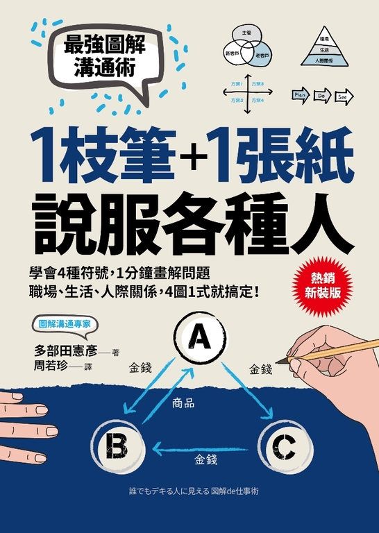 內容簡介 -最強圖解溝通術,學會4種符號,職場、生活、人際關係,4圖1式就搞定!-光是用「說」的,只能表達七%,加上「圖」,對方的「接受度」爆增九倍! ★只要會畫「圓圈、三角、箭頭、直線」,就能把所有的問題變簡單! 作者多部田憲彥小學時罹患口吃,從此與人談話成為他的夢魘。 直至工作後,遇見工廠老師傅學習「圖解與分析」, 利用圖解和語言不通的泰國員工溝通,才開始明白圖解的超強威力: 不只是口頭表達,畫圖分析(視覺資訊)更容易讓人理解所要傳達的訊息。 「圖解」,就是「用畫圖歸納出解決問題的方法」,訓練邏輯力是關鍵。 本書的圖解術簡單易懂, 不管是簡報工作、協商談判、生涯規劃、旅遊行程, 工作和生活中大小事, 只要會畫「圓圈、三角、箭頭、直線」, 就能把所有的問題變簡單! ★ 連【日產汽車CEO卡洛斯】都說讚的圖解分析力 提高商品的產能和品質、與合作廠商商談進貨價格、 同時控管多國分公司的工作進度…… 只要「簡單的圖」加上「關鍵字/數字」, 不必花時間集合開會,語言不通也能清楚「表達和溝通」! ★ 規畫旅遊行程、認識新朋友、就連找另一半,也能用圖解達成目標! 人生就是不斷的在做決定,選擇「適合」自己的選項。 但是,你真的清楚自己的「目標」和「問題」嗎? 把煩惱「寫下來」具體化,搭配簡單繪圖,原來解決問題這麼簡單! ◎「圖解」,不是你想的這樣: (X)漂亮精緻的PPT繪圖。 →只要會畫基本四種圖型,隨時隨地,不限場合,都能用使用圖解。 (X)複雜的「心智繪圖」(mind map)。 →圖解的原理,是將「思考」和「資訊」具體化,新手也能用圖解溝通。 (X)要畫圖高手,才能使用。 →圖解溝通只需要用四種簡單的線條圖,只要畫得出來,就能溝通。 (X)只能用在解決工作上。 →找出問題、分析做法,無論生活大小事,都能用「圖解」分析、解答。 (X)討論困難的問題時,才能使用。 →空想,容易陷入死角。用圖解把思考「具體化」,是分析、找答案的最佳辦法。 【圖解,讓生活有更多可能!】 很多人都會誤以為「圖解,是用在簡報上的東西」吧? 當然,在簡報時利用圖解也很有效果。 事實上,圖解是用來整理思緒、找出解決問題的方法時最棒的工具。 單用「想」抓不住重點,寫出來才能讓問題「被看見」。 透過畫圖,「好或不好」、「要或不要」等基準就能變得更明確, 思緒也更能有條不紊,解決問題的方法,自然就會浮現。 單用頭腦思考事情,其實容易抓不到重點,而且有很多矛盾之處。 若能把這些想法寫出來,將它們「具象化」,頭腦就能更清醒,思緒也更清晰。 這就是為什麼使用簡單的「圖解」和「關鍵字」說明, 就能達到超乎想像的「思考、溝通、表達、說服」效果。本書特色 圖解除了教你「溝通」,還能教你什麼? ★培養邏輯力:圖解能擺脫問題盲點,逆向思考,分析各種可能! ★想法具體化:每天寫下所有想法,練習具象化思考。 ★激發創意潛能:不用計算機,畫圖也能計算成本! ★節省時間:使用便利貼在瑣碎的時間圖解做筆記,無形中也能完成公事