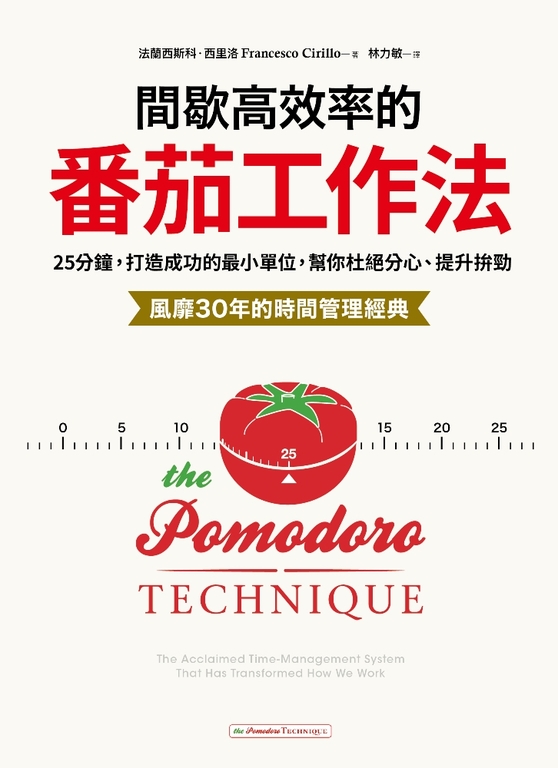 內容簡介 "國際媒體、全球暢銷書、高效大師、頂尖人士爭相引用的時間管理法「番茄工作法」創始發明人首度授權繁體中文版風靡30年經典,為數位時代全新修訂改版,幫個人與團隊提升專注力、精準達標!★ 《華爾街日報》、《哈佛商業評論》、《衛報》、《每日郵報》盛讚推薦★ 準備考試、規劃專案進度、掌握團隊進度、自主進修學習都適用★ 從個人到團隊,可運用於各層面,實現大小目標★ 本書附有圖表範例說明◎ 全球數百萬人實證的高效時間管理術1987年9月,法蘭西斯科.西里洛為了考試,需要念完三本書,卻靜不下心,因為干擾太多,容易分心,也沒拚勁。無意間發現,廚房裡的番茄鐘計時器,讓他重拾平靜,準備周全,通過考試。1992年,他把「番茄工作法」系統化,研究出──為什麼番茄鐘會有效?一個番茄鐘時段該設定為多久?一天能進行幾輪番茄鐘時段?每個番茄鐘時段之間,需要休息多久?1998年到1999年,開始傳授這套時間管理,經過無數次實驗與驗證,他發現,工作25分鐘、間歇休息5分鐘,是最理想、效率最不會下降的方式。2006年,將番茄工作法寫成書,自費出版,截至2013年,電子書下載次數超過200萬次,改善數百萬人的工作效率,受到國際媒體、時間管理大師、頂尖人士引用。◎ 間歇、高效率的最佳單位──25分鐘一般人會想一口氣、全力以赴把事情做完,但往往效率不彰,越做越沒勁,番茄工作法之所以有效,在於有助發揮間歇、高強效的專注力,一個番茄鐘只有25分鐘,不可打斷、不可分割,沒有半個或1 4個番茄鐘,每天檢視該做的事,並預先為每項任務規劃需要多少個番茄鐘才能完成(本書提供專屬表格)。執行任務時,當一個番茄鐘結束,必須間歇休息5分鐘,馬上放下工作,趁機起來走一走、喝杯水、想一下放假去哪裡玩、跟同事聊天說笑……讓頭腦消化吸收剛才25分鐘的工作內容。但休息時間不可做很費心神的活動,例如:跟同事聊工作,寫電子郵件,打重要的電話……避免妨礙頭腦整合,影響下一個番茄鐘的專注度。如果規劃一項工作超過5到7個番茄鐘,就表示這件事太過複雜,必須拆解成小事項。◎ 與時俱進,為數位時代、團隊合作全新改版但經過三十年,網路和社群媒體改變我們的習慣與行為,在資訊不眠不休的數位時代,番茄工作法如何發揮功效?於是,本書為最新增修版,除了解決頭腦與外部資訊干擾,還首度提出團隊如何使用番茄工作法來節省時間和提高生產力,並附有大量圖表範例,詳細拆解番茄工作法的方法與架構,更完整分享達標的時間管理心法,產生改變人生的強大動力。只要利用25分鐘、間歇休息5分鐘的高效成功單位,不僅學生能改進讀書方式,專心念書;上班族還能改善工作方式,拿來解決複雜問題,完成更多工作;主管更能提高團隊合作的效率,達成目標。本書你將學到:.整套番茄工作法的五步驟:計畫、追蹤、記錄、加工、想像.25分鐘途中被打斷,該怎麼辦?.如何解決想起身喝點或吃點東西,想上網查資料的頭腦干擾?.如何避免被同事、同事、電子郵件的外部打擾?.一天可以做幾輪番茄鐘最有效率?.如何把番茄鐘應用在團隊工作?"