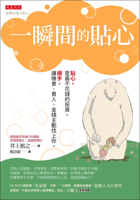 內容簡介 ◎與人約碰面,你得早到,但要表現得「好像才剛到5分鐘」。 ◎請客,安排在自己熟悉的店;聚會後,記得適時遞上薄荷糖。 ◎讚美對方外表,不如佩服對方人品。怎麼說最貼心? ◎當對方說「不用客氣」,你可別真的不客氣。例如點菜。 以上這些行為,就是貼心:一種出於關愛、體諒和感謝對方的心情, 順手自然表現出來的行為,是最不花錢的投資, 這種一瞬間的貼心,機會、貴人、金錢自動找上你。 作者井上裕之是日本銷售130萬冊的暢銷書作家、企管教練、潛意識治療師, 他的本業卻是牙醫師。 每次有年長女士來做假牙時,他總會多說一句 : 「我會幫您把假牙做得美美的,讓您看起來很年輕喔!」 這種一瞬間的貼心,舒緩了患者的緊張,師奶們口碑相傳使他的生意不斷, 當他把貼心舉動應用在其他方面,更讓他本業以外的工作邀約不斷。 貼心,是天生的嗎?一點也不! 作者特別針對工作職場、家人與朋友關係,列舉許多不花錢的暖心訣竅。 ◎這些小舉動,讓人不知不覺喜歡你。 與人碰面,你當然要提早到,但貼心的人會表現得「好像才剛到5分鐘」! 送禮,不要太貴,免得對方覺得你別有用心, 真正貼心的禮物是,這東西背後有洋蔥! 萬一是你收到禮?怎麼回?親筆寫回函最有誠意,就算字醜也沒關係。 要寫些什麼呢?本書有範例。 ◎比實力更重要的事,老鳥看在眼裡,卻不會告訴你。 交給主管的報告,一定要仔細檢查。這是避免對方來回確認的貼心。 跟客戶見面,儀容最重要,這代表你的誠意!該怎麼做好事前準備? 跟人約吃飯,要安排在自己熟悉的店;聚會後,記得適時遞上薄荷糖。 領到薪水或獎金,記得感謝主管或老闆,這是老鳥才懂的貼心之舉。 ◎對外人貼心,對親人也別怠慢。 怎麼對另一半貼心,不用耍浪漫,只要分享每日行程,並告知回家時間。 對待父母呢?告訴他們「和兄弟們都處得很好」,最能讓他們放心。 朋友應該怎麼相處?就算有些事情你不認同,聽聽就好,不要批評。 能否抓住人生的機會,其實與出身和學歷無關。 你要做的,就是貼心,讓人想「拉你一把」。 這是最不花錢的投資,機會、貴人、金錢都會主動找上你