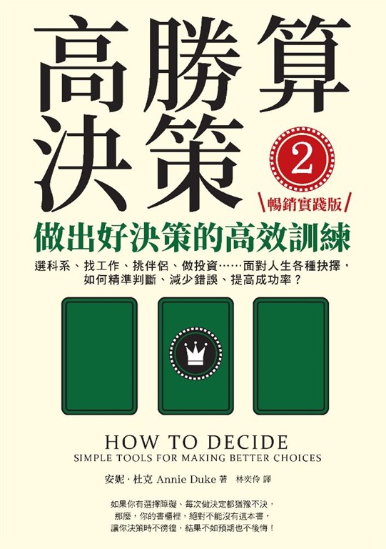 內容簡介 ★暢銷書《高勝算決策》作者重磅新作★\商業圈、投資圈、教育界、博弈界……一致好評/如果你有選擇障礙、每次做決定都猶豫不決,那麼,你的書櫃裡,絕對不能沒有這本書,讓你決策時不徬徨,結果不如預期也不後悔!★ Amazon.com商業類暢銷榜Top 100★ 入圍2020年洞見趨勢圖書獎非虛構類書單★ 知名企業創辦人、華頓商學院教授、心理專家……好評推薦★ 收錄各種練習、圖表和案例,讓你成為有自信的精準決策者面對大大小小的抉擇,都讓人覺得人生好難──.早餐、午餐、晚餐要吃什麼?.要就讀什麼科系、畢業後要做什麼工作、要不要轉職或轉行?.如何挑選對象、要不要跟對方交往、該不該結婚?.要投資哪一支股票?何時該買進、何時該賣出?.公司要不要轉型?策略要不要重新布局?無論你是學生、老師、家長、上班族、主管、老闆、投資人……只要有難以抉擇的困擾,必讀本書!《高勝算決策》上市後,獲得各界回響,賓州大學認知心理學博士、德州撲克世界冠軍、暢銷作家安妮.杜克,受邀到各大企業擔任商業顧問,協助高階主管、團隊和員工做出好決策。不過,她發現,多數人還是用結果論評斷一個決定的好壞,用錯誤的決策方法,也許運氣好,能帶來好結果,但無法保證下次用同樣的方法,也能有好結果,如果不想靠運氣,也不想掉入偏誤陷阱,就必須不斷修練。因此,催生第二本書,杜克把提高成功率的決策過程具體化,幫你克服各種決策難題——.從過往的決策經驗中,如何挑到自己的決策盲點?.如何跳脫主觀偏見,判斷一個決定的好壞?.怎麼從別人的意見中獲得有益的反饋,幫助自己做出正確決定?.什麼時候要迅速決定、什麼情況要慢慢決定,哪些情境要提前決定?.怎麼做出能讓你更了解自己的目標,並活出自我價值的決策?本書會套用各種常見的情境,例如:工作、婚姻、健康、投資……提供實用的練習、工具與方法,有效提升決策品質——.畫出決策矩陣:拆分決策品質與結果品質,避免事後諸葛、後見之明.建立決策的多元宇宙:畫下每個決定可能帶來不同結果的決策樹,做出勝率最高的選擇.做出好決策的六步驟:幫你改善未來決策的品質,並客觀評估過往決策的好壞.進行反事實思考:發揮想像力,可以了解事情為什麼發生、為什麼沒有發生.觀點追蹤:靈活切換內部觀點與外部觀點,擺脫自身盲點,做出精確抉擇本書還有更多案例、練習、工具、表格、方法和檢查表,無論你要選科系、找工作、挑伴侶、做投資……,都能幫你做出精準的好決策,解決難以抉擇的困擾,就算結果不如預期也不後悔,讓每次出手的成功率都比過去高!