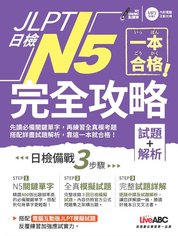 內容簡介 規模最大的JLPT日檢 全世界都在考日本語能力測驗(Japanese-Language Proficiency Test,簡稱JLPT),是一國際性的語言認證測驗,為提供世界各國的日語學習者一個檢測自身日語能力之檢定考試,簡稱日檢。此測驗由日本國際交流基金會與日本國際教育支援協會共同舉辦,於每年七月及十二月各舉辦一次。根據官方統計資料顯示,全球報考日檢的人數年年攀升,直至2017年全球之報考人數已達88萬人,實為規模最大的日語能力檢定測驗。然而,如同其他國際性語言檢定,日檢並無固定的測驗範圍或根據可依循,且試題內容靈活,經常讓有志報考日檢的人在準備考試時傷透腦筋。 無論是要升學考試赴日打工就職準備加薪升遷 日檢助你一臂之力近年,越來越多人報考日檢為取得一語言證照或作為加薪升遷的依據,而無論您是為了升學考試還是為了赴日打工或就職,參加檢定考試無疑是個了解自己語言學習成果的好機會。為此,LiveABC日語編輯部特別針對日檢規劃了這本《一本合格!JLPT日檢完全攻略(試題+解析)N5》,希望能提供有志報考日檢的讀者應試準備方向。首先,準備檢定考試時,最重要的就是掌握「關鍵單字」,並且在了解考試題型之後,再透過「模擬試題」不斷地演練。本書可分為「N5關鍵單字」、「JLPT模擬試題」以及「JLPT模擬試題詳解」三大部分; 日檢備戰3步驟:【STEP1】N5關鍵單字精選400個出題頻率高的單字,輔以清楚易懂的排版,並加上重音、詞性及例句等完整標示,讓您可以迅速理解詞義和用法,並且開口唸出單字加深印象,背單字不再是一件難事。日檢備戰3步驟:【STEP2】全真模擬試題+【STEP3】完整試題詳解本書完整收錄了三回JLPT模擬試題,內容完全仿照官方公式問題集之架構出題,可確實達到模擬考試的目的。最後,「JLPT模擬試題詳解」採用和前述模擬試題相同的排版,將題目和詳解做對照方便讀者閱讀,詳解內容包含逐題中譯與試題解析,不僅告訴您正確答案,更要告訴您解題關鍵在哪裡。透過三回「模擬試題」的練習,再搭配精美的「試題詳解」,讓您詳解讀一遍,勝讀好幾本日文文法書,上考場時遊刃有餘。