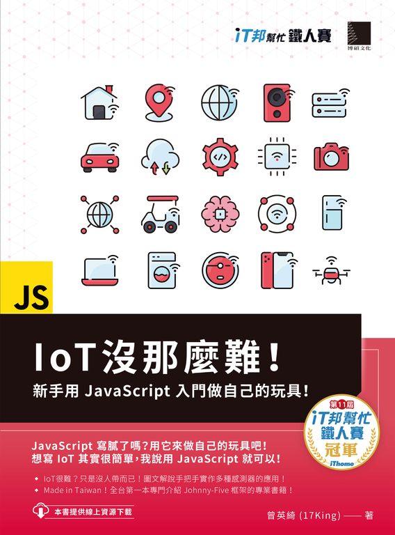 | 商品描述 | IoT沒那麼難!新手用JavaScript入門做自己的玩具!(iT邦幫忙鐵人賽系列書) (電子書):♛MadeinTaiwan!全台第一本專門介紹Johnny-Five框架的專業書籍!♛☀JavaScript寫 |