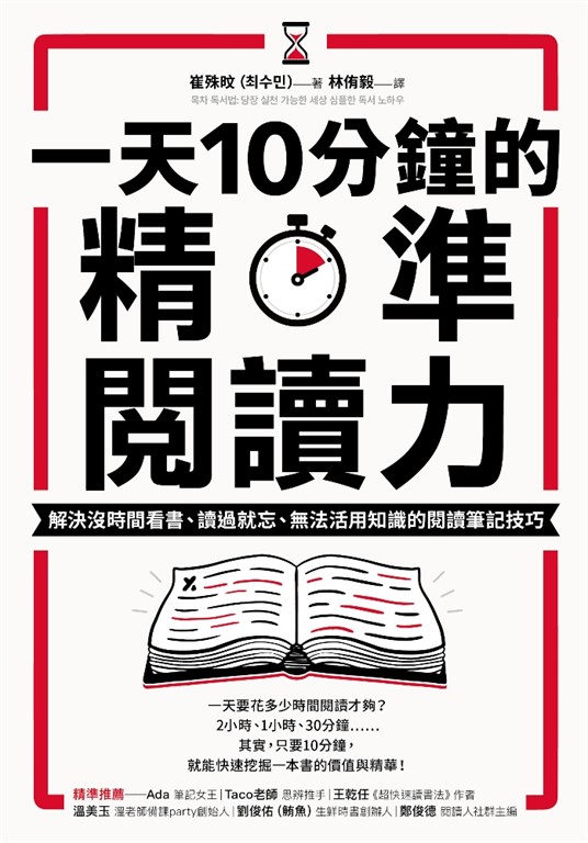 內容簡介 一天要花多少時間閱讀才夠?2小時、1小時、30分鐘⋯⋯其實,只要10分鐘,就能快速挖掘一本書的價值與精華!★ 韓國最大網路書店YES24「計畫/資訊/時間管理」百大暢銷榜蟬聯8週★ 最適合忙碌現代人的速效閱讀法★ 不分男女老少,任何人都能輕鬆學會.雖然知道閱讀很重要,想培養閱讀習慣,但總是半途而廢.買了一堆書,因為工作忙碌,根本沒空看.就算有時間,也無法專注,讀沒幾行字就開始分心.即使有劃重點、做筆記的習慣,卻沒辦法信手拈來、活用知識如果你有這些問題,就表示還沒找到一套適合自己的閱讀方法!◎ 閱讀,就像每天必須攝取的營養韓國斜槓暢銷作家崔殊旼,在身處人生逆境時,開始培養閱讀習慣,多虧書本,幫他度過生活中的各種考驗,尤其在面臨危機時,更成功透過閱讀將危機化為轉機。他體會到,閱讀不只是興趣,更是一種生活,如同每天必須攝取的營養。◎ 真正有效的閱讀,不是「讀」,而是從「抄」開始然而,崔殊旼想到自己即使讀了再多書,常常想不起讀了哪些書,就感到失望,某次,他在買書前,決定先在筆記本上,記錄書名和目錄,他發現,光是寫下書名和目錄,就能對書本的內容記憶深刻,即使真的忘記了,日後只要翻開筆記,就能立刻喚起記憶, 於是,他在部落格分享自己的閱讀技巧,得到許多回響。◎ 每天只要10分鐘,培養精準閱讀力因此,他把這套「目錄閱讀法」系統化,讓沒時間看書、讀過就忘的人,每天只要花10分鐘的時間,就能精準閱讀──.「抄」比「讀」更容易集中精神,提升專注力.抄寫,感覺很簡單,但一開始出錯,一步錯、步步錯,三步驟正確啟動「目錄閱讀法」.掌握書本核心內容的三種方法:多頁抄寫法、兩頁抄寫法、一頁抄寫法.如何找出每天10分鐘的零碎時間,喚醒閱讀細胞,輕鬆養成習慣?.學會「用一句話總結」一本書,貫穿全書核心本書還有更多培養精準閱讀力的筆記訣竅,幫你解決沒時間看書、讀過就忘、無法活用知識的困擾,透過閱讀帶來成就感,過上更精采、更富足的生活,成功改變人生!