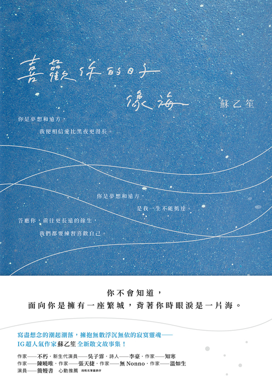 內容簡介 你不會知道,面向你是擁有一座繁城,背著你時眼淚是一片海。寫盡想念的潮起潮落,擁抱無數浮沉無依的寂寞靈魂──IG超人氣作家蘇乙笙全新散文故事集!你是夢想和遠方,我便相信愛比黑夜更漫長。你是夢想和遠方,是我一生不能抵達。答應你,前往更長遠的餘生,我們都要練習喜歡自己。#等待我們接受命運將我們帶到更遠的地方,那裡是沙漠還是海洋,那裡有星星還是仙人掌,那裡會不會有和你一樣的人?#練習該有多好,能遇見一個陪你共度餘生的人,他比你的心事都更明白你,也比你的呼吸更珍惜你,他讓你什麼都不用去想,只想著愛。#和好或許喜歡新的生活並不是這麼的難,適應新的我也只是遲早。那麼就可以重新來過。感謝命運讓我留在這個世界,讓我豢養花和陽光,背負著歌和希望。#共生我希望世界所有刀光劍影都與你無關,你能有最單純的善良,和最無憂的愛人。我希望世界對你好,如同我對你好。愛是日常,愛是牙膏和牙刷。愛是大海,閃耀粼粼波光,下一秒卻能讓愛裡的人覆滅。愛是海市蜃樓,有時漫長得像地平線,有時短暫得像霓虹。無從傾吐的故事,蘇乙笙說給你聽。無處安放的想念,蘇乙笙終於寫成了情書。在她的文字裡,我們等待愛,練習愛,與愛和好,和愛共生。然後我們終於有了勇氣,在漫漫餘生裡,等待更好的恰逢……名家推薦:【作家】不朽、【新生代演員】吳子霏、【詩人】李豪、【作家】知寒、【作家】陳曉唯、【作家】張天捷、【作家】無Nonno、【作家】溫如生、【演員】簡嫚書 心動推薦! 生命會有傷疤,也會充滿著期盼。我們在海裡沈溺,也在海裡重生。在不斷學著如何愛人的同時,也在努力地學著善待自己。這是乙笙的愛,也是我們獨一無二的海。 ──【作家】不朽回憶像散落的頁紙,乙笙將它們溫柔地收藏起來。在這些故事裡頭,有你和我曾經的悸動與淚水,把所有的感受細緻地訴說。拾起那些,無法言喻的自己。 ──【新生代演員】吳子霏在這漠大的旅程,搭乘各自的小船,一定會和誰遇見的,許多臉孔出現在視野裡,有的擦身,倏忽即逝,有的經過,留下故事。蘇乙笙的《喜歡你的日子像海》,彷彿身在茫茫人海裡,驀然回首,找尋那些一生也不會錯認的背影。《喜歡你的日子像海》是寂寞又美麗的現實經驗,承載著諸多點點滴滴,學會放下,匯集成廣闊的汪洋,海的跫音都是生命。 ──【詩人】李豪「枯美」,是我在讀這本書的時候,心裡突然浮現的一個詞。她在一篇篇的故事裡,寫盡她所感知到愛的百態,用文字誠實地記錄曾經像海那樣浮動的日子,一如無意零落在海裡的花,尋岸、向光卻無處安放。所有的筆觸都像她敏感的枝枒,嘗試觸碰、嘗試擁抱這個世界,一次、一次的綻放、損傷、凋落,悲傷也許是這個世界允她最多的養分,所以她寫下絕望,可她也寫下她所見僅少的光。枯萎並不是結束,只是為了下一次更好的開始。 ──【作家】知寒有的文字喧囂,有的靜默。喧囂的燦爛奪目,靜默的則曖曖內含光。蘇乙笙是後者。這本書裡的文字總靜默地發著幽幽的暗光,你以為光盡之處是出口,直至行步至此,你驀然領悟,這些文字並不是想引你到出口,不是指引你一個既定的方向,而是要陪著你到達你心底的,更遙更遠的遠方。最遙遠的遠方,原是最親密的近處,是我們情感的內陸,我們殷殷冀盼的歸鄉,她所寫的即是這樣的歸鄉。 ──【作家】陳曉唯她總是能用最溫煦的訴說,去輕撫每個太難以下嚥的傷痕,身為她讀者與好友的我,總是能被她獨有的柔暖治癒,在生活中、在文字裡。喜歡你的日子像海,只要你想起時,她就歸來。 ──【作家】無Nonno無所謂曾經的撕心裂肺,也無所謂假裝的雲淡風輕,每一種際遇都會成就更好的自己。那些淋過雨的歲月,終會翻山越嶺而來,成為光景之外的溫暖。被留下的疼痛和傷疤又或難以忘懷的心事,都沒有關係了,就讓這本書陪你們痊癒。 ──【作家】溫如生愛情,絕對是精神的重要糧食。但是我們的喜好口味有可能一輩子都不改變嗎?從乙笙的文字,感受到了她細膩靈魂釀出的愛情酒。豐富的層次變化,值得靜下心好好品味。 ──【演員】簡嫚書