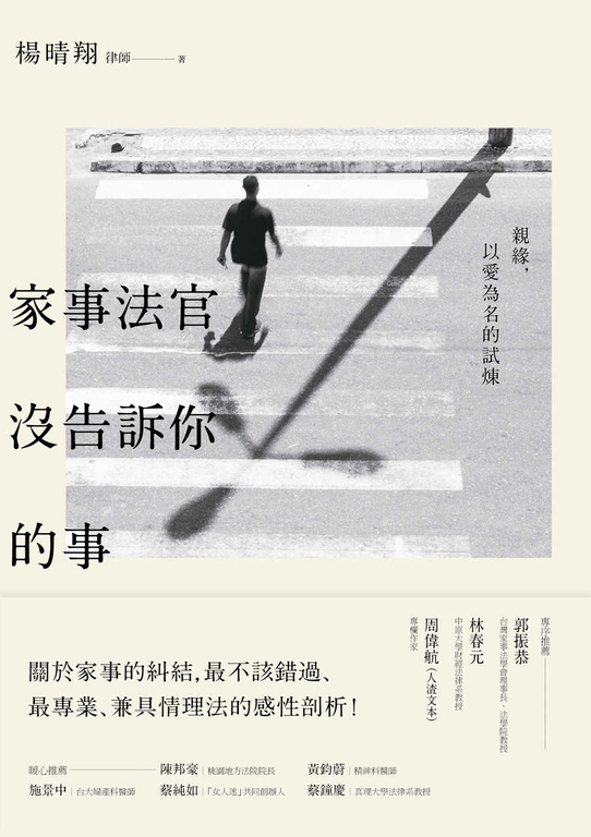 作者介紹 楊晴翔台大法律系畢業,非典型法律人,覺得只懂法律的人生太單調,酷愛攝影、偵探推理小說、體育賽事與戲劇、音樂的欣賞。2000年司法官特考及格後,分發桃園地方法院擔任法官,擔任法官期間取得中原大學財經法律研究所法學碩士、美國紐約哥倫比亞大學法學院法學碩士(Columbia Law School, NYC, LL.M.)。歷任刑事庭、民事庭、家事庭法官(2003-2013)。現為薈盛國際法律事務所主持律師之一,亦擔任中原大學財經法律系講師、(曾任)財金系不動產估價及管理學程講師。十年法官生涯後,搖身一變,成了執業律師。發現律師的工作更加貼近個案當事人的愁苦,並且近距離感受社會的脈動。也藉由理解當事人在訴訟過程中的心境跌宕起伏,與執法者心中思路的差距,解讀司法實務與國民法律感情之間的鴻溝。FB粉絲專頁:家事法官沒告訴你的事》》www.facebook.com judgeandlawyer