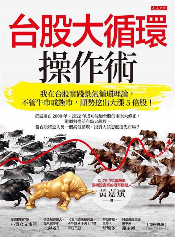 內容簡介 相書上常說,人每10年會走一個運, 其實,股市更是如此。黃嘉斌稱為股市大循環。 作者黃嘉斌,曾任國內大型金控下投資事業處副總, 曾精準預測台股從4,000點起漲到9,000點,會在2008年進入一波大修正, 於是他在當年金融海嘯中全身而退,隔年更帶領公司達到全年76.3%的報酬率。 當時,他精準掌握了大立光(3008)、系微(6231)。 10年後,他在2021年底,又預估台股將進入漲多必修正的高風險期, 果然2022年1月,台股偕國際股市大漲,盤中一度來到最高點18619.61點, 但其後俄烏戰爭爆發、美國升息,導致全球股市與台股大跌。 這一回,黃嘉斌又精準躲過了台股4,000點以上的修正, 還順勢提前布局當時股價才100元的藥華藥(6446)。 之後藥華藥(6446)一路上揚,股價最高來到622元,漲幅超過600%! 兩次的台股大循環,黃嘉斌都運用景氣循環理論, 成功推估高低走勢,不管牛市或熊市,順勢挖出大漲5倍股! 什麼是景氣循環理論?為何可以提前判斷大盤走勢? 當台股將進入另一個高低循環,投資人該怎麼搶先布局? ◎景氣循環如何判斷、如何順勢獲利? ‧股市行情經常與GDP連動 2015年臺灣GDP衰退3%多,當年台股下跌近千點; 2021年GDP比前一年成長3%,台股就衝上萬八; 2022年GDP預估在4%以下,比2021年減少近3%,就是應該保守的空頭年。 2023年呢? ‧景氣對策信號,藍燈、紅燈有祕密 當景氣對策信號落入藍燈區,且連續出現3個月,顯示指數離低點不遠; 若是進入象徵過熱的紅燈區,必須警戒行情將從高峰反轉向下。 現在的景氣對策信號是? ◎跟對景氣循環,每個時期都能賺 台股10年走一個大運,背後的推動力就是景氣循環。 只要依循著景氣循環的軌跡,就能研判股市多空。 ‧景氣復甦初期怎麼買?價值股獲利快、投資轉機股不能急 這個時期該投資那些倒閉機率低、景氣翻升時漲最快的龍頭股, 股價淨值比小於1,就是好選擇,例如亞泥(1102)。 ‧進入繁榮期,攻擊優先,就買飆很大的成長股 持續3年成長3成是基本要求,若是成長率每年增加,就更可能是飆股, 例如上品(4770)、元太(8069)都狂飆過。 ‧走入景氣泡沫期,賣股要快、狠、準,寧可少賺不要貪 台股現在處於景氣循環的哪一段?本書有答案。 ◎何時要保留現金?何時該all in? 月薪族、小資族請把資金拆成12份(或每月薪水固定留下一筆), 行情相對低檔時按月進場,持續下跌時可以加碼20%的資金。 但行情衝高時,只能買進6個月就要停。為什麼? 本書透過景氣循環圖,帶你從擴張期、繁榮期到泡沫期搶先布局, 掌握台股大循環,不管牛市或熊市,都能順勢挖出漲5倍飆股。