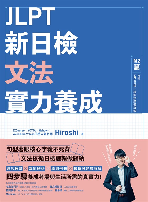 商品描述 | JLPT新日檢文法實力養成:N2篇(含MP3音檔 + 模擬試題暨詳解) (電子書):N2句型複雜永遠記不熟嗎?線上平台名師Hiroshi以「日檢邏輯」統整文法、從「核心字義」拆解句型觀念 |
