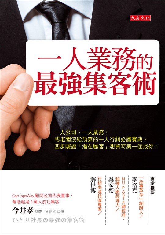 內容簡介 ◎網頁設計得很漂亮,但顧客還是不點擊、不想看、不下單。◎老闆不肯花錢在社群媒體買廣告,我這個一人行銷該怎麼辦?◎我是公司的唯一業務,到處跑展撒名片,但感覺都白忙,攬不到客人。以上這些,是你經常發生的哀怨嗎?這是一本針對一人公司、一人業務,或老闆不給預算的一人行銷,最強的集客寶典,讓你不再因「找不到潛在顧客」而抱怨連連。作者今井孝在任職大型IT企業期間,就打造首年營收數以億計日圓的成績;之後獨立創業,連續十年舉辦研討會,每次都有300人以上參加。其中,一家婚友社利用他傳授的最強集客技術,營收一年左右成長三倍,賣伴手禮的一人公司,聽了作者建議,沒幾個月轉虧為盈,還有幼兒園、律師事務所仿效作者的操作方式,顧客就自動上門。當大家都在抱怨景氣不好生意難做,找不到客人時,作者說,只要掌握四步驟:邂逅、拉近距離、評估、購買,90天內就可大幅提高營收。◎我的最強集客術,從「不做」開始一聽到集客,多數人以為要到處推銷商品, 但作者的集客卻相反:他不忙著找潛在顧客,先找有時間聽他說話的人,也不急著上門拜訪,而是廣發名片和資訊,讓有需要的顧客自己上門。還有,他不會只聯絡「看起來會買的人」,因為這個人買還是不買,第一眼根本看不出來。所以不管對方想不想買,他都先給贈品或提供服務。這就是最強的集客基礎。◎集客有四步,多數人輕忽第一步 :邂逅(實體虛擬都算)集客就是:邂逅、拉近距離、評估、購買。第一步最重要,卻經常被忽略──你得先遇到人,而且是很多人。但,我要邂逅幾個人,才會出現一個願意買的人?又該如何製造和他人相遇的機會?作者有方法。◎邂逅之後的關鍵的時刻:評估與購買集客的關鍵不在「說」,而是「聽」,你得聽出客戶的心情、煩惱或希望:逐一解決他想買又不敢買的疑慮 : 不滿意保證退款、免費修理、分期付款;再一一合理化他應該購買的理由 :你該犒賞自己、這是為了家人安全……萬一沒效呢?沒關係,給個贈品,他一定會再來找你。不管是一人公司、一人業務或老闆從不給預算的一人行銷,只要掌握邂逅、拉近距離、評估、購買四個步驟,再也不會因「找不到潛在顧客」而煩惱。