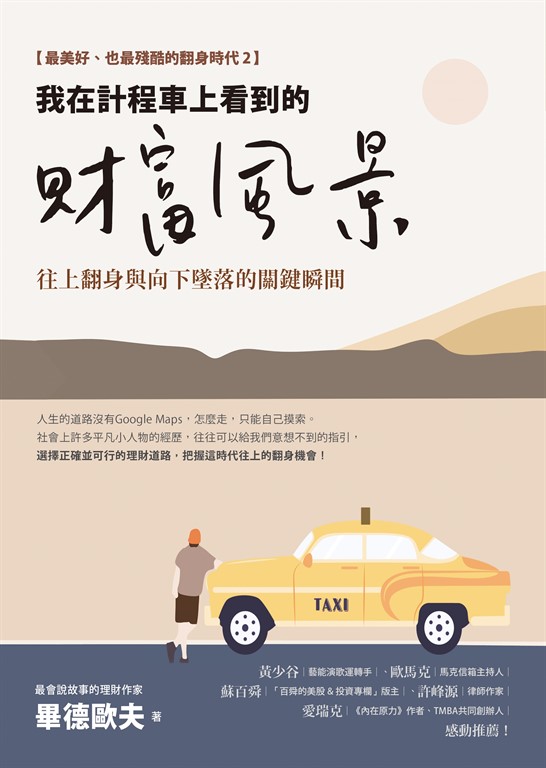 內容簡介 人生的道路沒有Google Maps,怎麼走,只能自己摸索。社會上許多平凡小人物的經歷,往往可以給我們意想不到的指引,選擇正確並可行的理財道路,\\把握這時代往上的翻身機會!//繼暢銷書《最美好、也最殘酷的翻身時代》,最會說故事、最懂小人物拚搏心情的理財作家畢德歐夫,這次將娓娓道來每一趟短短計程車旅程聽到的精采人生。● 述說著人生好想重來的酒店大老闆,最讓他後悔的是什麼?● 做過當鋪老闆的運將大哥,看到了什麼樣的殘酷社會?● 板橋的田僑仔第三代,為什麼還需要為買房兼兩份工作?● 按照計畫存到兩千萬退休,為什麼現在還來跑計程車?● 到底要存多少才能退休?退休後,花的錢會變多還是變少?人生美好或苦悶,經濟能力可以決定六成以上。我們或許達不到財務自由,仍要努力讓自己在財務上更有餘裕。就算手中盡是壞牌,也要謹慎出牌。因為人生能收穫的和失去的,比你以為的還要多。書中四十位運將,有曾經的遠洋大副、當鋪老闆、賭場員工、銀行理專、開餐飲的老闆、工程師、大學生等等。有不少運將是退休後很無聊,出來繞一繞,也有些人是走投無路,有些人則是茫然還找不到目標。從運將的人生經驗,我們可以看見每個時點所做出的每個財務決策,都決定著之後的人生樣貌,也可以由此發現理財的盲點、陷阱,建立正確的金錢觀念,把握往上翻身的機會,並避開失足墜落的風險。盼每個人都能盡早摸索出屬於自己的人生方向!▍畢大想跟你分享的是:# 忽略網路上的雜訊,一心一意往前走,沒人能擋住我們追求更上層樓的決心!# 不要把金錢妖魔化,把財富的累積當作是罪惡感,這是資本主義最重要的一課。# 這是比自律、比耐力的一場人生馬拉松。偏偏大多數人缺乏耐心,缺乏紀律,而且不小心就走了歪路,然後一轉眼就是中年以後的樣貌。# 這社會的凶險超乎我們的想像。請記得,不要讓財產放在流沙上面,隨時都可能消失幻滅。# 賺一塊錢不是賺一塊錢,省一塊錢才是賺一塊錢。# 吃不窮、穿不窮,不會規畫就一輩子窮。# 珍惜現有的一切資源,做好最佳配置,這就是一種理財的概念。# 人生有四十年的時間可以工作,累積財富,再搭配良好的理財習慣,有什麼理由不走正道?▍黃少谷/藝能演歌運轉手:『當我們搭上計程車,便是與一個陌生生命的短暫交錯。已經當一段時間運將的我,每個月都會載到至少兩百個人生,不管是到哪裡,或短程或長程,你我都互相幫忙過。感謝認真記錄下這些人生故事的畢大。每個人的財富不會是相等的,但對生活的重視與要求,我們大家都可以一起努力提升。』▍歐馬克/馬克信箱主持人:『打開臉書,期待看到畢大今天又坐到什麼樣司機的車,已經成為一種日常生活習慣了。在馬克信箱讀了這麼多信,我深深體會到每個人都是有故事的人。畢大用一篇篇與運將的對話,寓理財觀念於聊天紀錄中。感謝畢大讓我們有幸可以藉由閱讀別人的人生故事,提醒現在的自己可以怎麼為未來做打算。』▍蘇百舜/「百舜的美股&投資專欄」版主:『畢大再度以他溫暖、平易近人又淺顯易懂的行文風格,完成了一本理財佳作。和前作一樣,畢大的理財書從來不會讓人看了想睡覺。這本書包含了各式各樣的人生故事,和各式各樣的理財觀。有成功的、失意的,值得我們學習和警惕。推薦給大家!』▍愛瑞克/《內在原力》作者、TMBA共同創辦人:『人生沒有白走的路,每一步都算數;畢德歐夫沒有白搭的計程車,每趟對話都很有意義──沒有白踩的坑,當事人的辛酸血淚都可以成為我們的借鏡,他們學到教訓,我們得到經驗。從與不同背景的運將對話中,洞察人生百態、吸取生活經驗、淬鍊成有用的智慧。寫實而真誠,每一則結論與提醒都令人深思,是理財、理人生很好的參考書!』黃少谷/藝能演歌運轉手歐馬克/馬克信箱主持人蘇百舜/「百舜的美股&投資專欄」版主愛瑞克/《內在原力》作者、TMBA共同創辦人許峰源/律師作家────感動推薦!