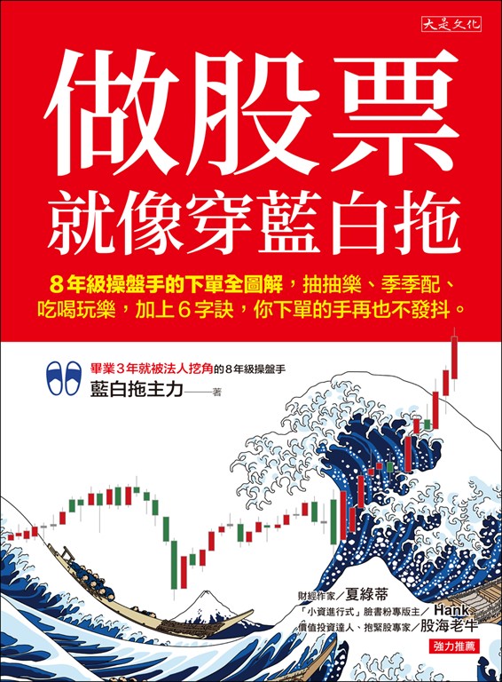產品目錄 推薦序一 投資永遠不缺標的,缺的是如何擬訂策略/Hank推薦序二 新手小白停看聽,投資必修懶人包/股海老牛推薦序三 學會投資,是現代人不可規避的課題/夏綠蒂作者序 投資要像藍白拖,舒適、實用、方便第一章 我是8年級操盤手,即將財富自由01 每檔股票都有三種價,面額、市價、淨值02交易平臺上的五大英雄聯盟03掛牌也有階級之分:上市、上櫃、興櫃04 只想買一股,手滑竟然變一張?嚇呆!05投資工具百百種,股票變現最快06 買股賺什麼?小賺股息大賺價差07 那年,我存到3萬元就進場08各類投資商品的難易度比較09賠錢不是投資的風險,是結果10投資最常犯的三大錯第二章 滿20歲那年,我給自己的生日禮物01 人生最棒的成年禮,線上就能完成02 股票市場不是便利店,沒有24小時服務03 台股一天漲跌幅頂多10%,膽小者免驚04 集合競價類似拍賣會,逐筆交易就像當鋪05 股票交易稅懶人包,魔鬼藏在細節裡06 一秒鐘幾十萬上下的下單學07 違約交割是有刑責的,新手記得念三遍08 獲利的關鍵,看懂即時走勢圖09 股票也有抽抽樂,每次成本20元10 藍白拖最愛季季配,春夏秋冬都有錢領第三章 找買賣點有3種方法,懂一種就夠01 從公司基本面看價值,花時間,卻踏實02 技術分析,知道何時進攻與防守03 看懂籌碼面,搭上主力順風車第四章 選股,是一種生活態度01 選股六字訣:你有、你能、你要02 我最愛的股票:吃喝玩樂股03 買就跌、賣就漲?道理簡單但主力會騙人04 想要搶短線,先弄懂撞球原理05 10個當沖9個輸,沖浪客不好當附錄 藍白拖主力答客問01 升降息代表什麼意思?02 什麼是經濟危機、金融海嘯?03 財經新聞常提到鷹派、鴿派和貓頭鷹派,這是什麼?04 沒時間的人怎麼投資?05 什麼是0050?誰適合買?06 金融股真的風險很小嗎?07 定期定額買股有風險嗎?08 我買的股票一直跌,該怎麼辦?09 股市動物園,牛、熊、黑天鵝、灰犀牛代表什麼?10 質押是什麼?前一陣子新聞很紅.11 新聞常報外資抄底大賺出場,什麼是抄底?12 飛機不能飛?為何要發布禁空令?13 新臺幣匯率和台股有什麼關係呢?