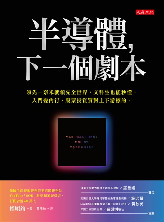 內容簡介 ◎封裝是半導體產業中的低科技?錯,封裝是鋼鐵人動力服,是業者決勝關鍵。 ◎為什麼手機越來越小,功能卻能變強?因為「微縮」技術,台積電全球最強。 ◎石墨烯為何被稱為「神之材料」?未來可以用在半導體上嗎? ◎哪家企業左右全球半導體市場?台積電還是三星?其實是設備大廠艾司摩爾。 本書作者權順鎔,韓國生產技術研究院的半導體與封裝材料研究員。 同時經營YouTube「SOD」科學頻道,訂閱者近60萬人。 他最厲害之處,就是能用生活實例, 解釋這個左右全球經濟命脈、但又小到你根本看不見的半導體。 像是多數人聽來都霧煞煞的半導體八大製程,他就用刻雕像來比喻: 先準備一大塊四方形的大理石(晶圓製程),然後在表面上塗料(氧化製程), 再用雕刻刀與槌子(氟化氫)刻出大致的形狀。 過程中你可能會刻錯,所以需要準備尺(光罩)等工具來輔助, 最後再細細的修出線條(微影製成)……。 他還用蓋房子、接水管,來比喻半導體目前遇到的物理限制, 用切披薩的原理來描述產能,用《航海王》的故事來比喻怪物晶片, 再搭配簡單易懂的圖解,文科生看了秒懂,股票族能聽懂產業分析, 買對上下游投資標的。 ◎半導體,領先一奈米就領先世界 想讓智慧型手機變小,半導體就得「微縮」到奈米, iPhone 13搭載的A15仿生晶片,就由台積電利用「5奈米」製程打造, 5奈米有多大?長寬都只有1公分,但上面卻要放上億個元件, 難怪許多人將半導體比喻為一幅最精細、優雅的畫作。 ◎哪些科技未來最會賺?股票族如何布局? 物聯網時代的主角,是感測器,每輛汽車平均有300個感測器,目前特斯拉最多; 最新半導體材料——量子點,做出的顯示器厚度只有5.5微米,你可以穿在身上。 聽過「怪物晶片」嗎?有個超級電腦以能算出「打噴嚏時病毒會如何散播」聞名。 ◎往後10年,半導體的下一個劇本 三星電子的三進位半導體若成功商業化,以後手機充一次電,就能用1,000天。 只要靠一滴水,也能點亮LED?以蒸散作用驅動的發電機已進入研發階段。 討論度越來越高的鈣鈦礦太陽能電池,也不容忽視, 厚度是現有電池的六十分之一,特別適合用在穿戴型裝置上。 本書含括半導體科學原理、最新技術、相關市場動向與展望, 文科生也能秒懂,股票族買對上下游投資標的。
