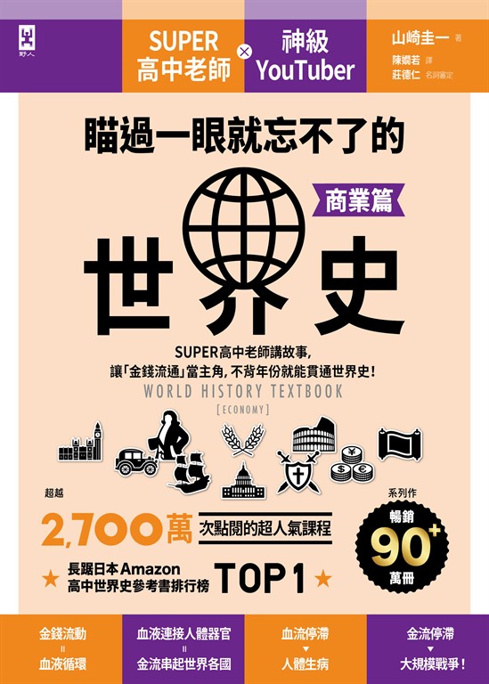內容簡介 ★★★系列暢銷90萬冊!★★★ ★★★日本Amazon高中世界史參考書排行榜TOP1★★★ --------------------------------------------------------------------------------- SUPER高中老師╳神級YouTuber╳最強「圖像記憶法」 超越2,700萬次點閱的超人氣課程 --------------------------------------------------------------------------------- ▌為什麼我們需要了解「歷史中的金流」? 世界各國就像身體的各個器官, 金錢和貨物就像血液, 血液流過全身,串聯起各個器官, 就像金錢和貨物流通於世界,把國與國連結在一起。 血液滯留在器官,人會生病; 金錢停滯在某個國家或地區,就會引發大規模戰爭。 ▌了解歷史中的「金流」= 了解國與國之間的「連結」 讓金錢流動把歷史串成一個完整故事, 學歷史從此不再暈頭轉向! ➤以「商業活動」為主角,輕鬆掌握世界史脈絡! ●北義大利為何可以最早展開文藝復興?原來義大利商人透過蒙古帝國與元朝縝密的東西向貿易網絡,網羅中國、印度、波斯的物產而獲得「財富密碼」! ●世界因為「辛香料」而串連?過去歐洲商人原本可透過陸路貿易取得亞洲香料等物產,卻遇上「路霸」鄂圖曼帝國阻撓,乾脆發展水路貿易,沒想到全世界因此串連了起來。 ➤用「橫向剖面」看世界各地的連結,全方位架構歷史視角! 將世界史劃分成10大時代,從地理位置由西向東解說同一時代下世界各地的商業發展,全方位補充你的歷史視野! ●因貿易稱霸世界的英國、荷蘭,輸出殖民地產品的同時也「大撒幣」購入亞洲物產,想不到大量白銀流入卻導致鄂圖曼帝國的「沒落」? ●全球化之下,美、日出現「產業空洞化」,工廠紛紛外移至東南亞,不料卻遇上一件事讓「成長神話」奏停? ➤年分OUT!稱霸歷史課不用死背硬記 流暢故事線+易懂圖表,讓你簡單理解歷史故事的前因後果, 加深印象,考前複習更輕鬆! ▌本書架構 【每章章首】世界地圖標示本章重大事件+各地區重點提示,一眼記住每個時代重要商業活動! 【內文】重點標記+穿插地圖&事件解說圖表,最強化視覺記憶!