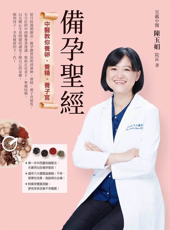 作者介紹 陳玉娟 現任台北宜蘊中醫診所院長,前北醫中醫婦科主任,行醫逾20年。每月門診求診人次破千人,診治案例超過萬例。仁心仁術、視病如友,不僅醫病也醫心,更有「好孕大長今」之稱號。她二十歲被診斷為不孕,以中醫醫治自己的不孕症,擁有一男一女後,發心期望能透過中醫專業,幫助人們在求孕、身體調養這條路上,走得更為順遂。專長:不孕症、經期/經痛調理、養卵、胚胎植入前後調理、安胎、過敏體質調理、孕產前後調理、睡眠障礙、更年期障礙。