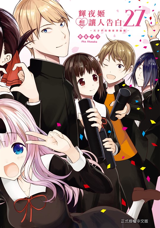 內容簡介 學生會會長.白銀御行與副會長.四宮輝夜在精英雲集的秀知院學園學生會相遇…。雖然這2個天才兩情相悅,彼此卻一直設法要讓對方愛上自己、主動向自己告白,他們將在日常生活中使出渾身解數鉤心鬥角,演出全新感覺的愛情喜劇!…原本是這樣的2人已經發展成為情侶關係,並且經驗了分手…。而在設法克服四宮家家族紛爭騷動的時候,輝夜正式地成功實現了讓白銀”向她告白”的願望!本以為將能回歸平穩的日常生活,但白銀出國留學的日子卻也一刻刻地在逼近---。故事接近真正最高潮的第27集!